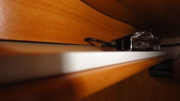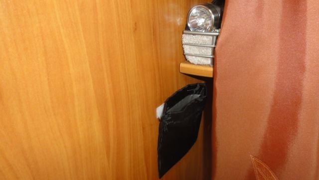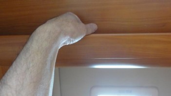 Die Oberschränke ums Bett sind nach unten mit einer Zierleiste abgeschlossen, in die man von unten hineingreifen kann.