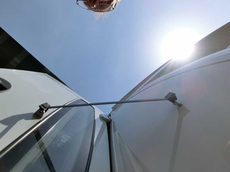 Für ganz offen benutzen wir bei Wind eine Schnurschlaufe zum Beifahrertürgriff, aber eine fixierte 90-Grad-Position ging nicht.