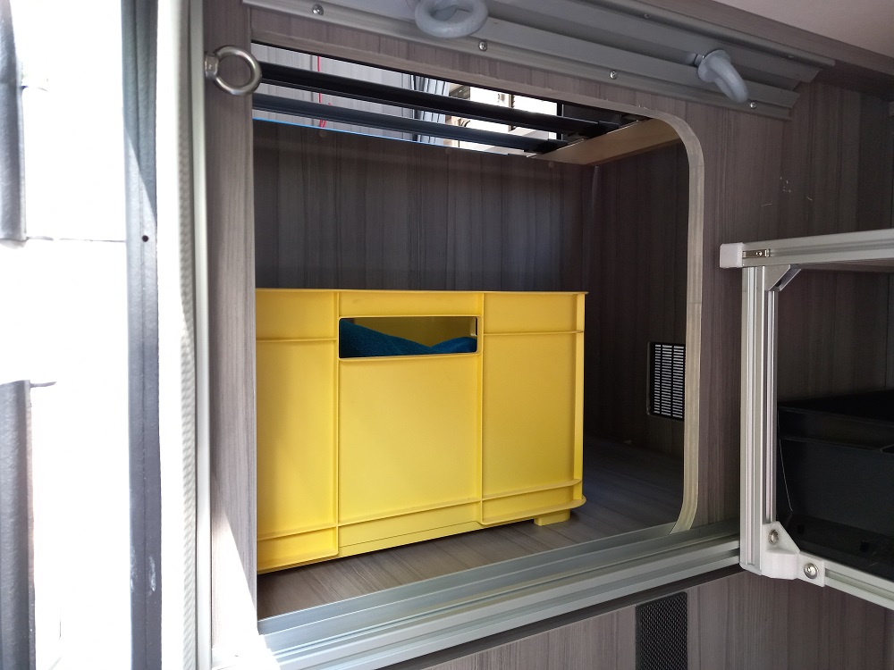wir hatten schon länger nach einer Optimierung für das Staufach unterm Bett Fahrerseite gesucht. Öffnung zum Kleiderschrank oder zu den Treppenstufen war es irgendwie für uns nicht, Klappe nach außen auch nicht so recht.