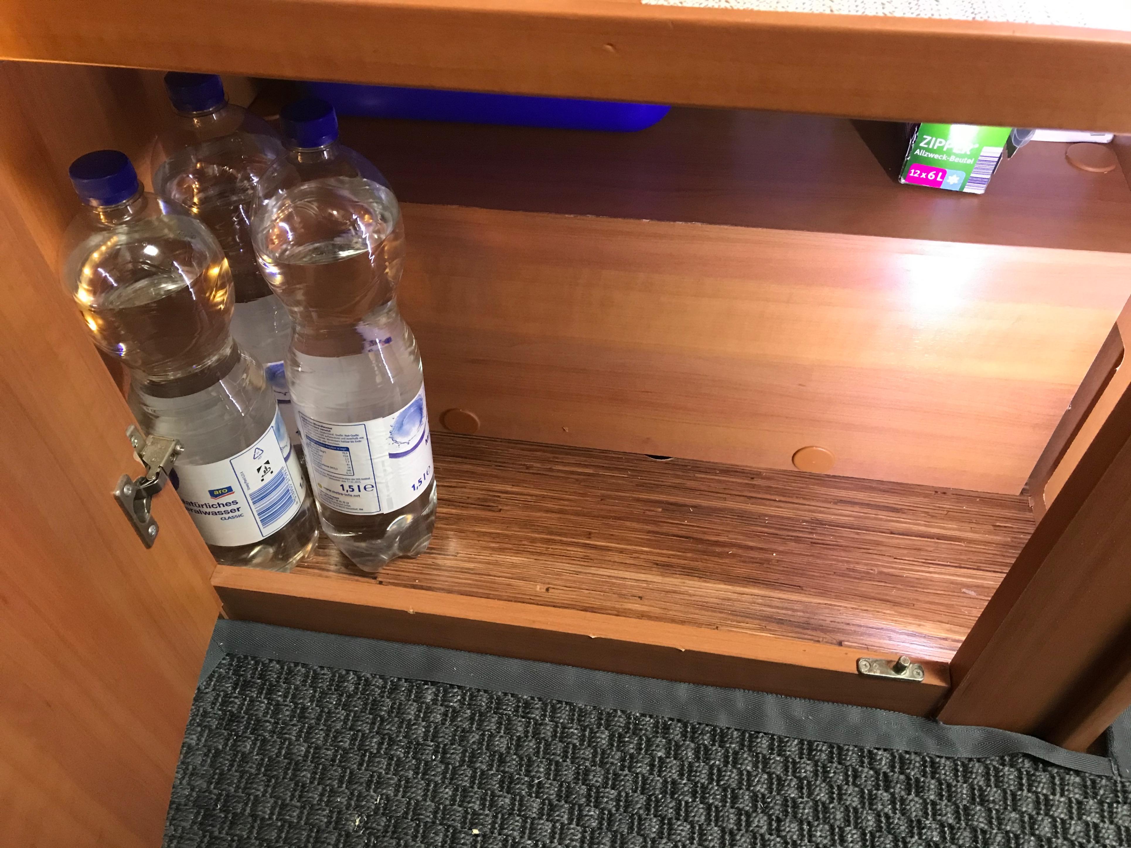 Im Toskana Exclusive ist die Abdeckung über dem Radkasten in beiden Hochschränken eine absolute Platzverschwendung. Im Schrank neben dem Kühlschrank hatte ich bereits im letzten Jahr umgebaut. Heute war der Schrank neben der Küchenzeile dran. Knapp 15cm konnte ich das untere Brett kürzen. Dadurch passen dort jetzt locker 12 x 1,5l Flaschen rein.2.)