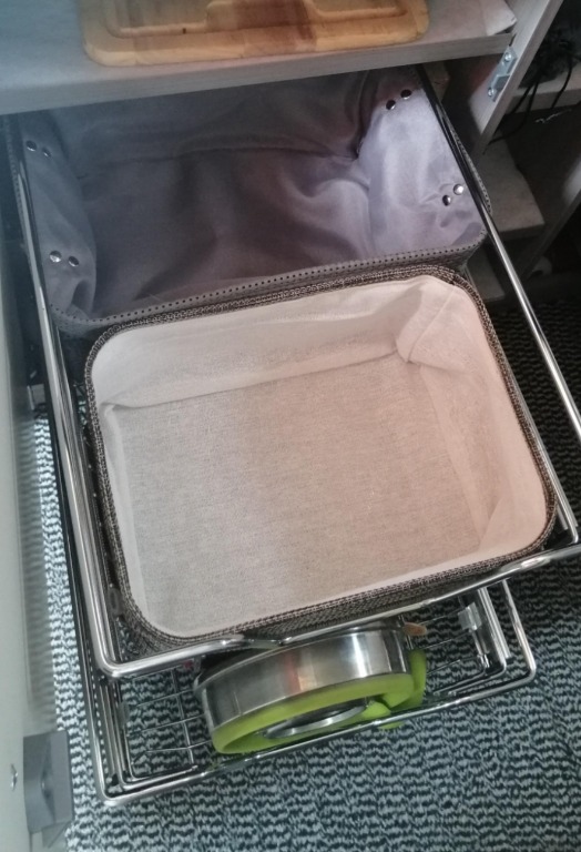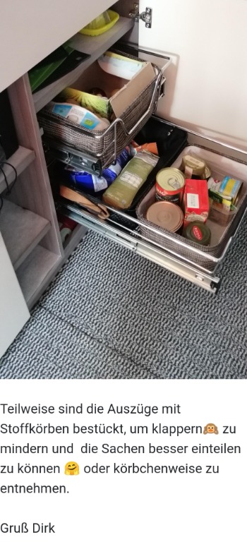 nachdem ich jetzt alle vier Drahtkorb-Auszüge drin habe, wollte ich mal alle Drahtkorbauszugsbesitzer fragen, wie ihr das Scheppern der Töpfe verhindert. Klar, man könnte einfach ein Tuch oder sowas reinlegen, aber das verrutscht sicher schnell oder sieht nicht so schön aus. Wie sehen da eure Lösungen aus oder ist euch ein bisschen Geschepper während der Fahrt egal?