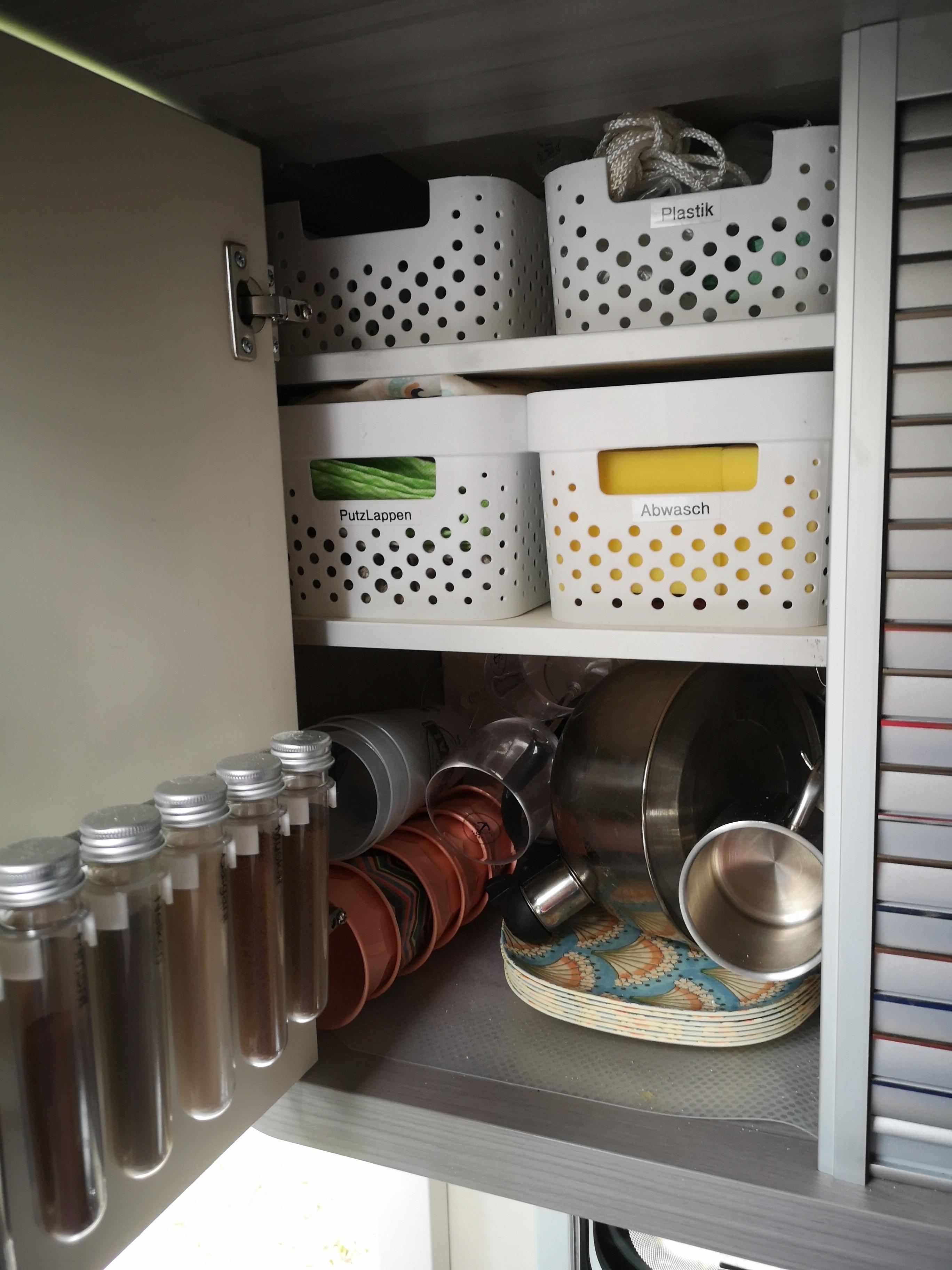 Mir ging unsere Unordnung im küchenschrank oben links auf den Geist. Lappen, Schwämme, Plastiktüte irgendwie oben reingewürgt.