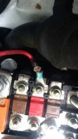 Also immer weiter gesucht bis ich an den Anschluss in Batterienähe kam. Dort ist eine Plastikabdeckung über diverse Anschlüsse, an dem auch der isolierte Kabelschuh für die Stromversorgung des Kompressors für die vordere Zusatzluftfeder angebracht war.