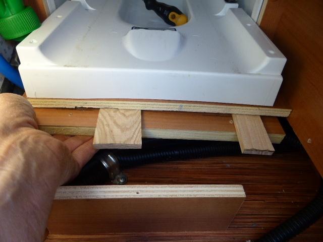 2) Das senkrecht stehende Stützbrett ausbauen, die Schraube befindet sich hinter dem Brett, evtl. mit Spiegel arbeiten. Die hintere Auflageleiste ist mit dem Bodenbrett unter dem WC Kunststoffteil verschraubt und die Schrauben sind nicht zugänglich. Deshalb mit etwas Gewalt mit geeigneten Holzkeilen dieses ablösen. Weiterhin beide Befestigungsschellen aller Schläuche und Kabel die im Weg sind lösen. Jetzt hat man in der Höhe 7cm Freiraum um zum Syphon zu kommen.