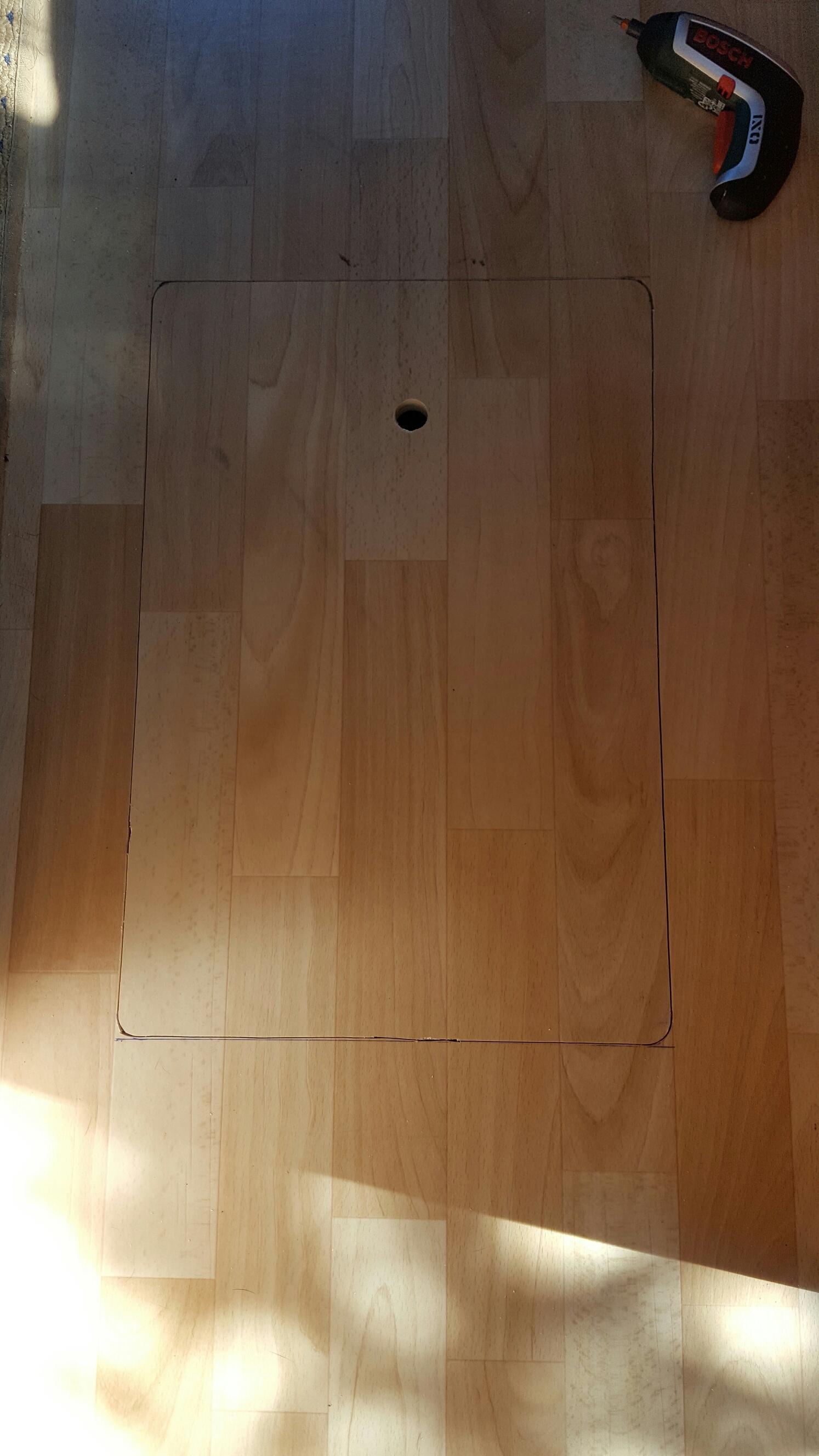 Also Stichsäge ausgepackt und ein großes Loch in den Boden gesägt. Und siehe da der neue Stauraum ist 950x800x210 mm groß B) B)