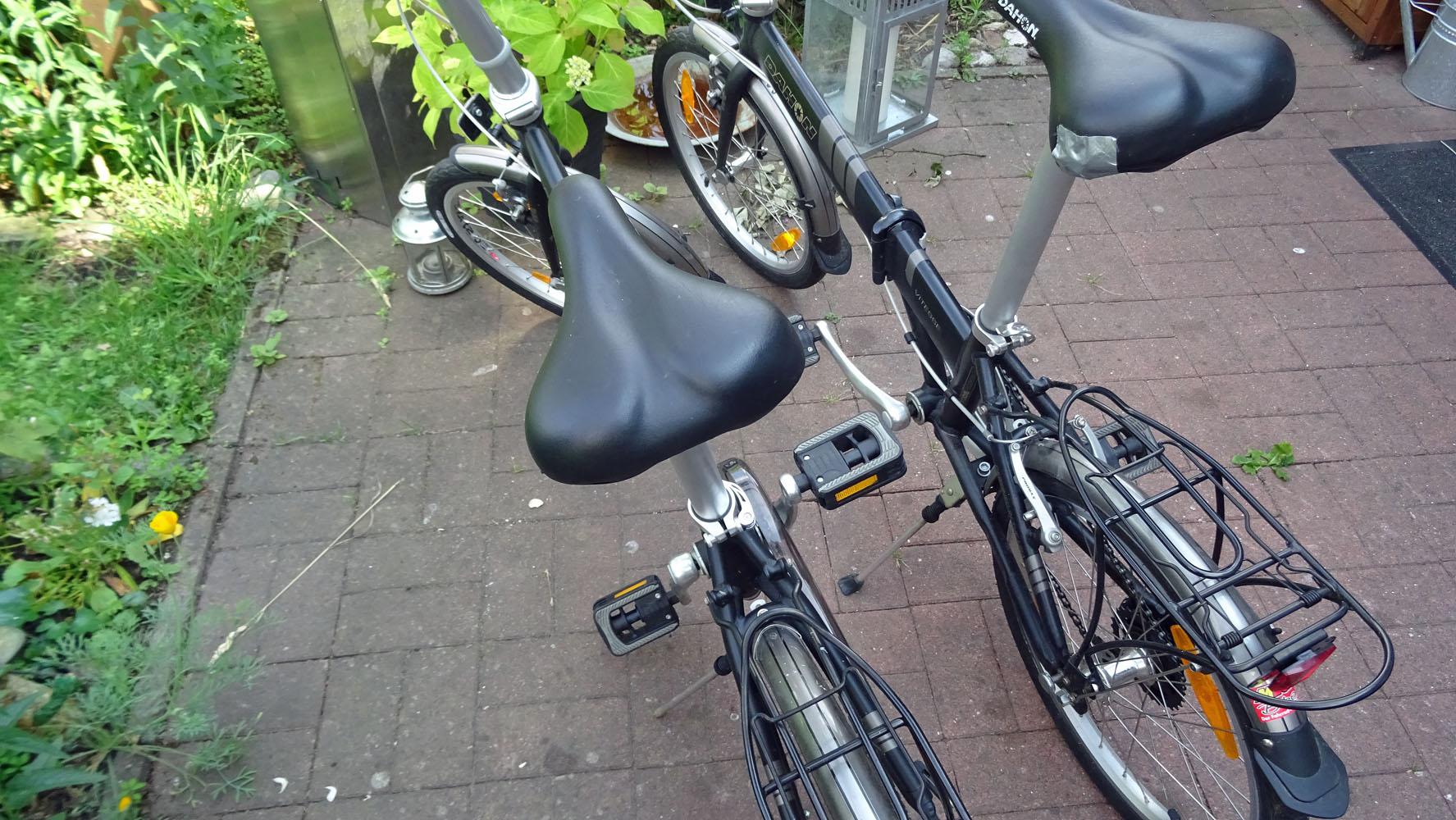 wir haben zwei Dahon-Klappfahrräder abzugeben. Die dienten uns einige Jahr (vor etwa sieben Jahren von uns neu gekauft) als "Beiboote" in den Wohnmobilen, haben eine geringe Laufleistung und normale Abnutzungsspuren (eines hat einen kleinen Riss am Sattel, den ich überklebt habe). Eins von Beiden (das "Mädchenrad") hat eine Drei-Gang-Nabenschaltung, das andere (das "Jungsrad") hat eine Sieben-Gang-Kettenschaltung. Beide waren vor drei Wochen zur Inspektion in einer Fachwerkstatt in Rendsburg und sind daher tadellos in Schuss. Der Neupreis der Räder (ich hab leider die Rechnung versuselt) lag irgendwo bei rund 350,- bis 400,- Euro pro Rad. Zwei passende Taschen von AWM würden wir ebenfalls mit abgeben.