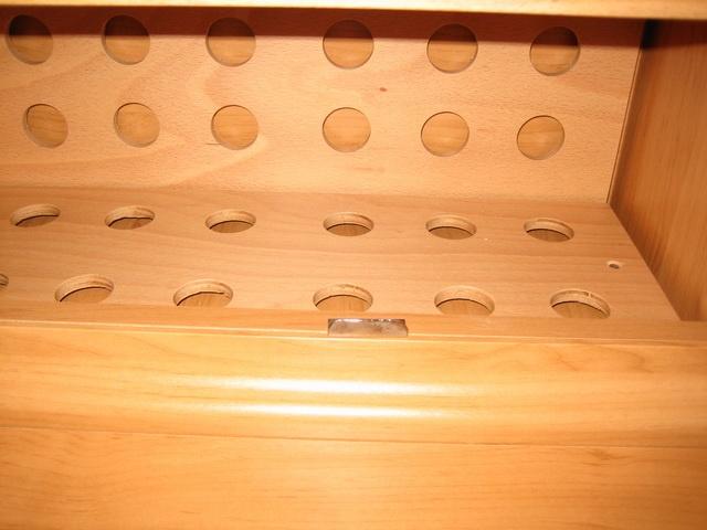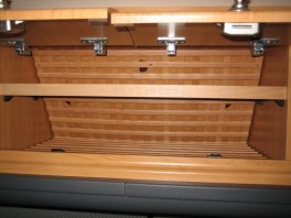Ist mir noch etwas zum Thema Feuchtigkeit und Vorbeugung im WoMo eingefallen. Im vorderen Bereich Oberschränke im Fahrerhaus, habe mir Anfangs meiner WoMo Karriere, wenn ich WoMo gesehen habe welche vorne keine Schränke haben gedacht, da wurde bei der Einrichtung gespart!! Vielleicht ist es auch tatsächlich so. Dann wurde aber unbewusst etwas vorbeugendes damit erreicht. Wir haben bei einer unserer Reisen im Spät-Herbst bemerkt, wenn es draußen Minusgrade hatte und wir in der Nacht die Heizung an hatten egal wie hoch die Innentemperatur war, sind die Rückwände von den Oberschränken Feucht gewesen, so das es mit der zeit auch unten am Boden Feucht wurde. Die Ursache war klar als Wärme – Kälte - Schall und Branddämmer habe ich mir doch etwas gemerkt. Die Warme Luft strömt durch die Fugen ca. 5 mm durch und kommt mit der Kalten Rückwand in Berührung und dann entsteht Schwitzwasser ähnlich wie zu Hause, wenn man die Schränke zu nah an die Außenmauer stellt. Die erste Maßnahme war am Boden ein Handtuch auflegen wenn wirklich Schwitzwasser Abläuft wird es aufgesogen und der Schaden wird vermindert, die Wäsche mit Abstand zur Rückwand am Abend hinlegen und die Türen offen lassen. Das hat Funktioniert war für mich aber nicht die beste und schönste Lösung man sieht zwar in der Nacht nicht das die Schränke offen sind, hat mich aber morgens immer gestört, es musste eine bessere Lösung für immer ohne offene Türen her. Nach langer Überlegung habe ich dann in die Rückwände Löcher mit 35 mm gebohrt und den Zwischenraum von Rückwand und Isolierung im GFK Bereich mit 2 Komponenten Schaum ausgefüllt, die Rückwände und Böden habe ich Abgeklebt so das nur die Löcher frei waren wegen der Verschmutzung. Es Funktionierte man muss den Schlauch verlängern um in alle Ecken zu gelangen und nicht alles auf einmal schäumen wegen der Ausbreitung vom Schaum das er nicht zuviel drückt. Nach dem Aushärten habe ich den restlichen getrockneten Schaum entfernt und die Löcher mit Stopfen aus braunem Kunststoff verschlossen. Um auf Nummer sicher zu gehen habe ich noch an der Rückwand und am Boden einen Holzrost mit Distanz zu Rückwand und Boden montiert, und jetzt ist es 1 nicht mehr so kalt in den Schränken und Feuchtigkeit gibt es auch keine mehr, um sich das besser vorstellen zu können gibt es davon einige Bilder dazu. Vielleicht hat der eine oder andere von euch das Problem, oder es noch gar nicht bemerkt, und wenn nicht, dann hoffe ich das ich mit meinem Beitrag für eine Behebung oder Vorbeugung dazu beigetragen habe. In diesem Sinne auf ein trockenes WoMo. (Siehe Foto unten)