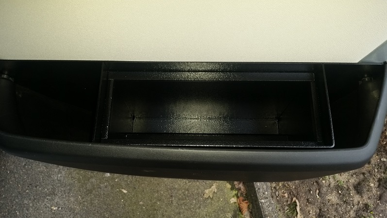 Es gibt eine größere Version, welche anstelle des Ablagefachs eingebaut wird. Da passt dann auch ein großes Notebook rein. Befestigt wird der an den Verschraubungen der Verkleidung und man hat dann oben drauf über die gesamte Breite eine Ablagefläche. Der Preis ist übrigens sehr ähnlich.