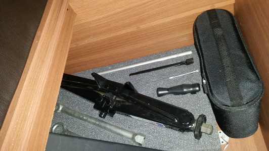 Weiß jetzt nicht genau wie das bei Eurem T65GE ist, aber die HA an unserem Fahrzeug bekäme ich bei einem notwendigen Reifenwechsel mit dem originalen Wagenheber ohnehin nicht hoch, bzw. das wäre mir viel zu gefährlich. Wir haben zwei 5to Hydraulikheber an Bord, welche zusammen mit dem Teleskop-Radschlüssel im Gaskasten ihren Platz finden. Die brauchen zusammen übrigens weniger Platz als das originale Zubehör.