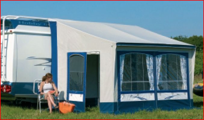 Freistehendes (mit Rückwand) qualitativ sehr hochwertiges Reisemobilvorzelt im originalen Hobby Design.