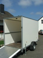 Die Seitenwände sind aus verrottungssicherem Polywood und der Aufbau aus Aluminium. Die Heckklappe ist zweifach abschließbar.