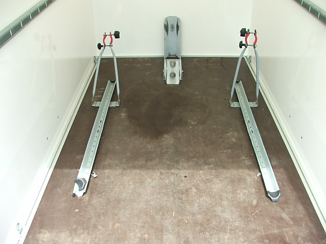 Zwei Heckstützen zum sicheren Auffahren. Auffahrrampe mit Riffelblech belegt. Ich habe noch zwei Fahrradhalter montiert die könne aber, genauso wie die Wippe, demontiert werden. Die Edelstahldiebstahlsicherung ist auch dabei.