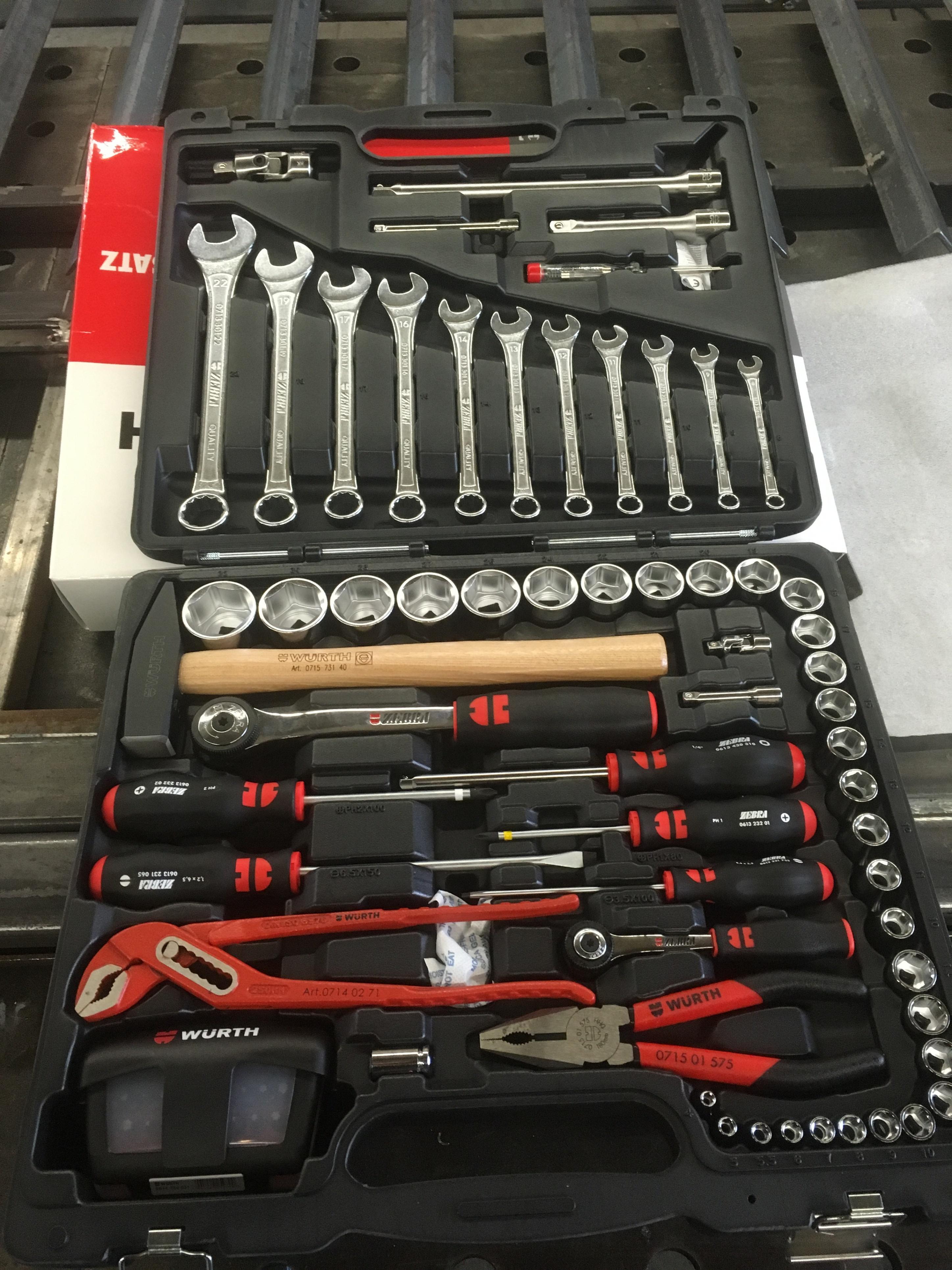 • Nun, da ich ja eine alte Tonne fahre, habe ich mein Werkzeug selber zusammen gestellt. Ich führe in der Kiste eine Knarre mit den gängigsten Nussgrössen und Maul wie Ringschlüssel ebenfalls in diversen Größen mit. Unterschiedliche Schraubenzieher und zangen,Hammer aus Metall und einen aus Gummi sowie eine kleine Pucksäge.Akkuschrauber ist auch mit dabei, ein multimeter und diverse Kabel, schrauben, verbinder und Panzertape. Eine kartusche dichtmittel und eine Presse dafür sind ebenfalls an Bord. Ein Sortiment an Sicherungen für alle Bereiche habe ich auch im Gepäck.