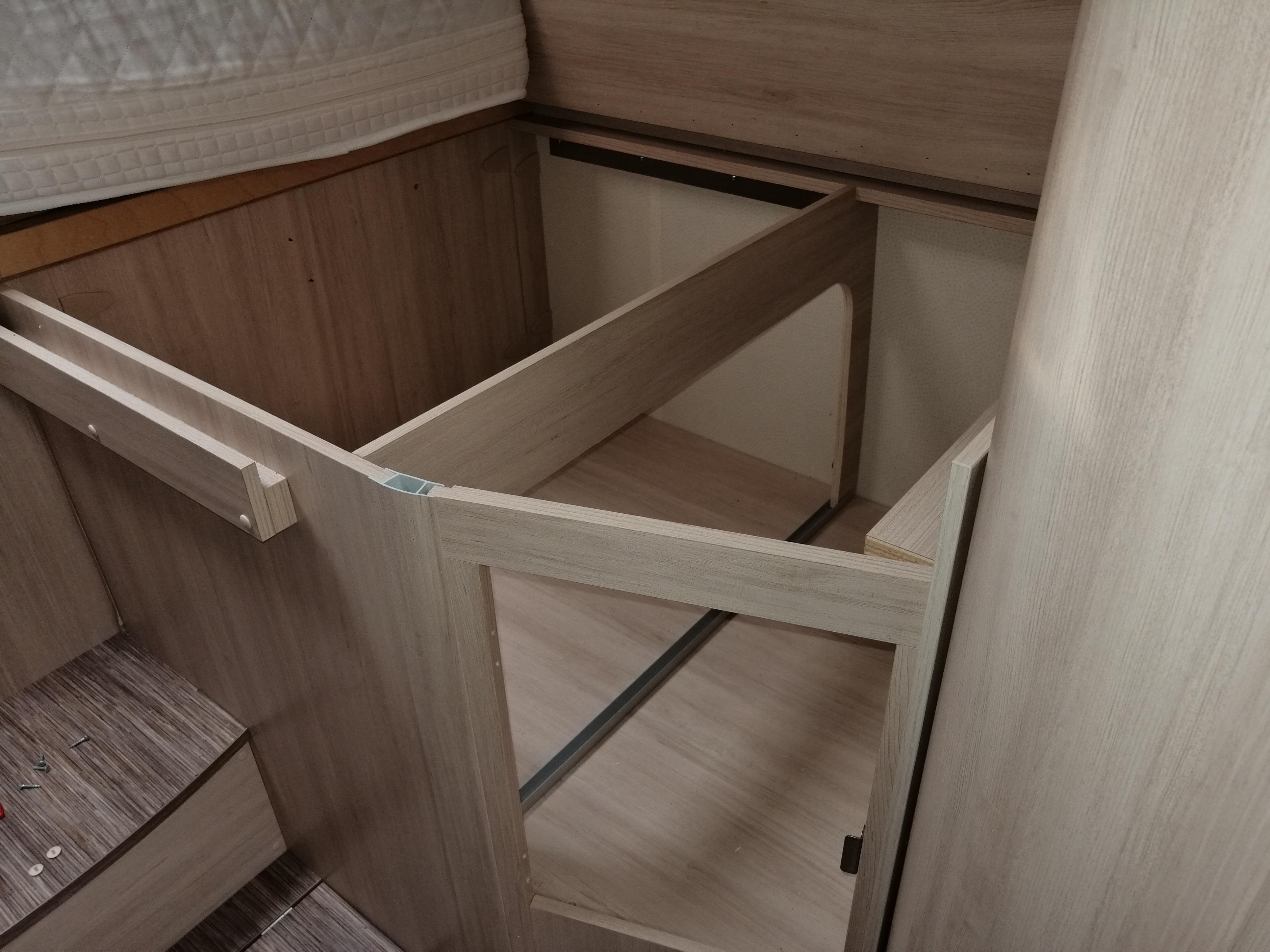 Ich würde gerne den Stauraum unter dem Bett, welcher nur durch das hochklappen erreichbar ist, zur Heckgarage erweitern. Dort ist eine Wand, die durch Schrauben eingesetzt ist verbaut (Bilder).