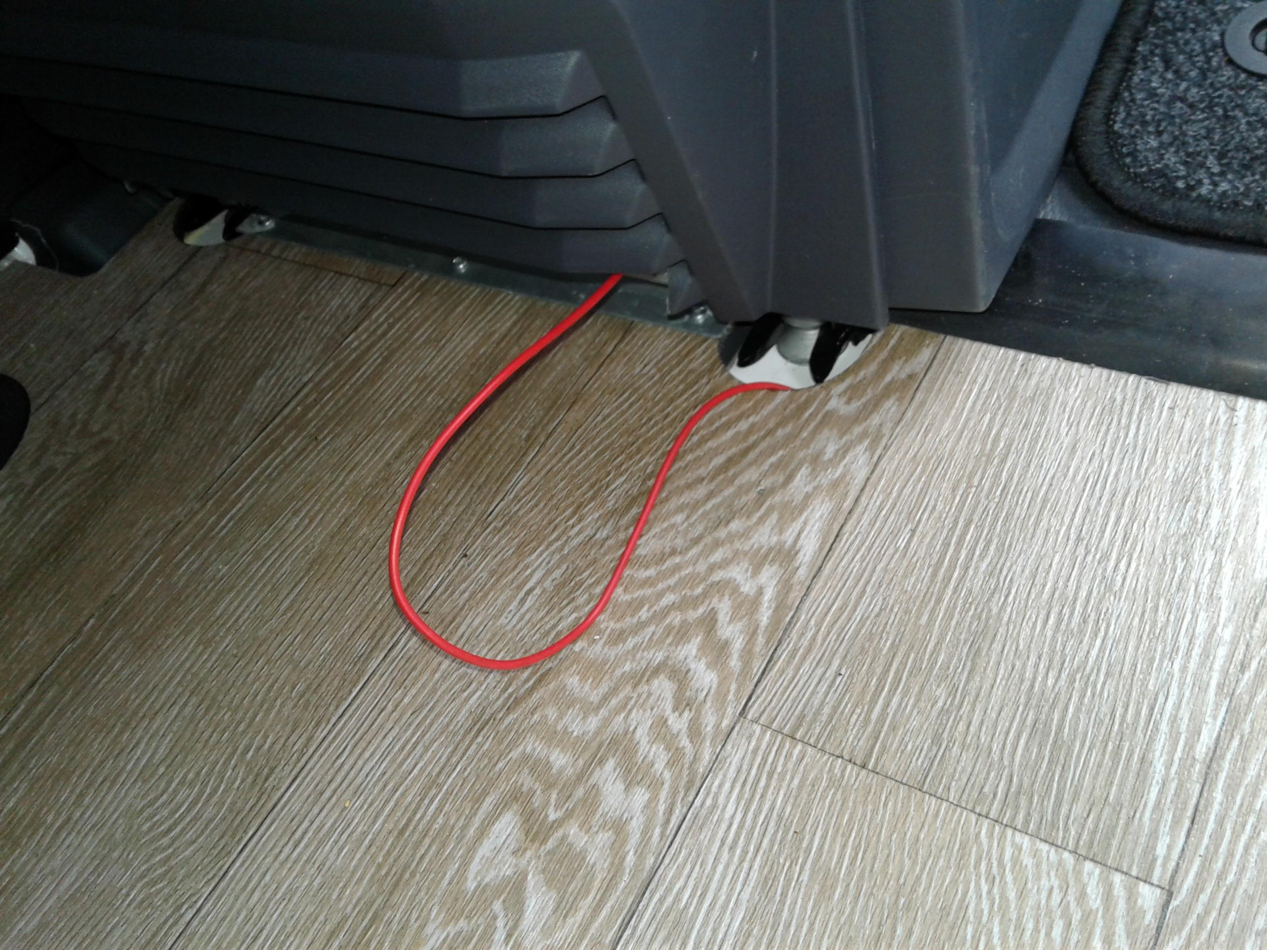 wir haben uns vor der Auslieferung von unserem Hobby-Händler noch einen Batterie-Computer Büttner MT 5000 iQ einbauen lassen. Bei der der Übergabe fiel mir direkt ein dünnes rotes Kabel auf, dass von der Fahrersitzkonsole in den Boden geht und auf der Beifahrerseite wieder herauskommt. Es ist nicht gegen Verrutschen gesichert und lässt sich zwischen den Sitzen geschätzte 20 cm hin-und herschieben.