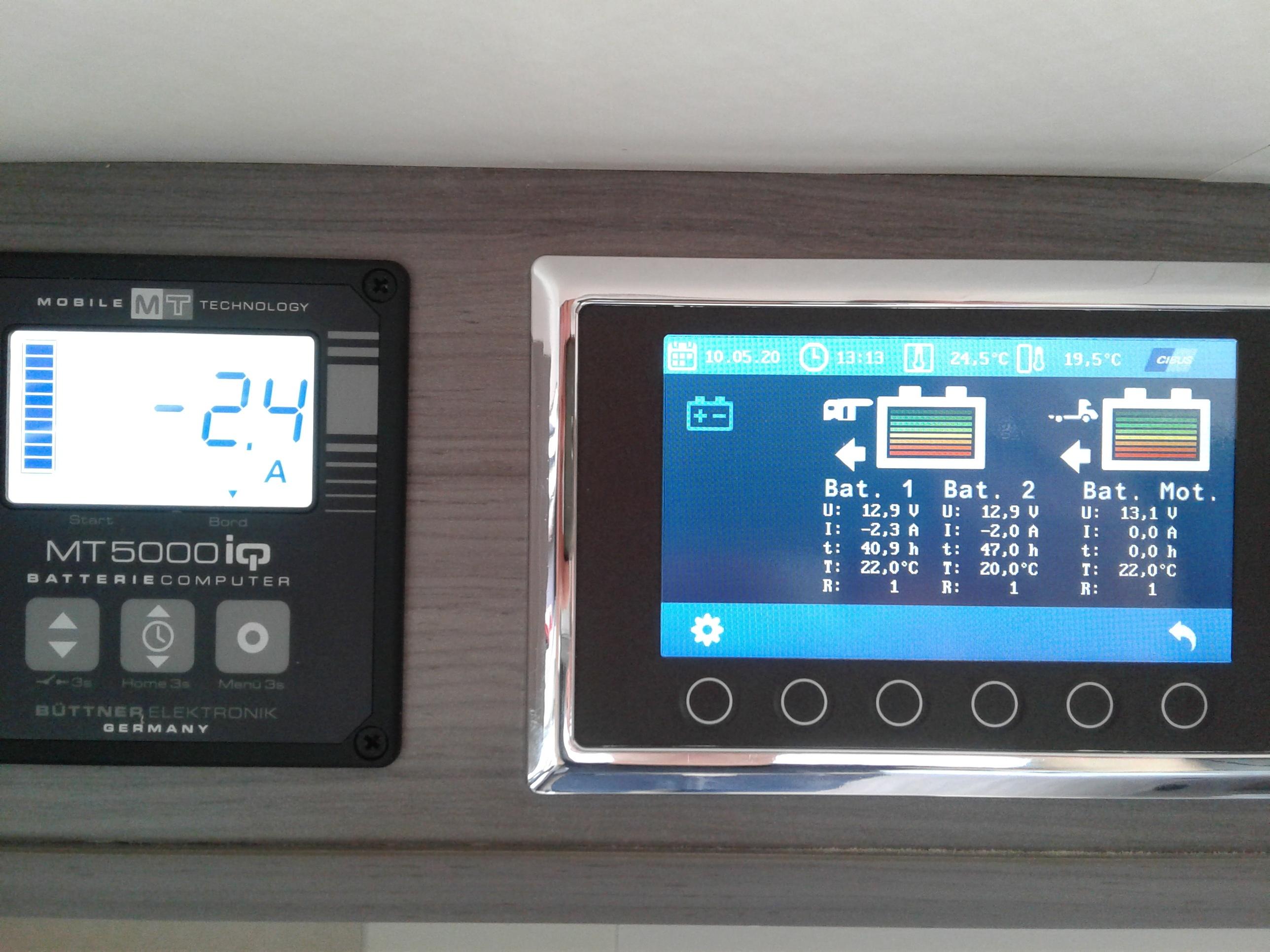 Die Anzeige der Büttner 5000 iQ gibt mir auch noch einige Rätsel auf. Wir haben zwei Aufbaubatterien 95 Ah AGM ab Werk verbaut. Im Hobby-Display werden diese einzeln mit leicht unterschiedlichen Strömen angezeigt. Ist dies normal? Ich dachte, die Batterien werden parallel angeschlossen und sind dann von der Logik her eine Batterie mit 190 Ah Gesamtkapazität. Bei zwei leicht unterschiedlichen Strömen vermute ich auch zwei installierte Hella-Batterie-Sensoren. Als Restlaufanzeige zeigt der Büttner immer [-,-h] an, obwohl im Hobby-Display 39,2h bzw. 49,5h erscheint. Liefert der Büttner nun eine 2-stellige Stundenanzeige (also maximal 99h) oder ist das eine volle Ziffer plus eine Dezimal-Stelle? Dann würde ja erst ab einer Restlaufdauer von 9,9 h etwas im Display erscheinen Die Bedienungsanleitung gibt leider keine Information dazu.