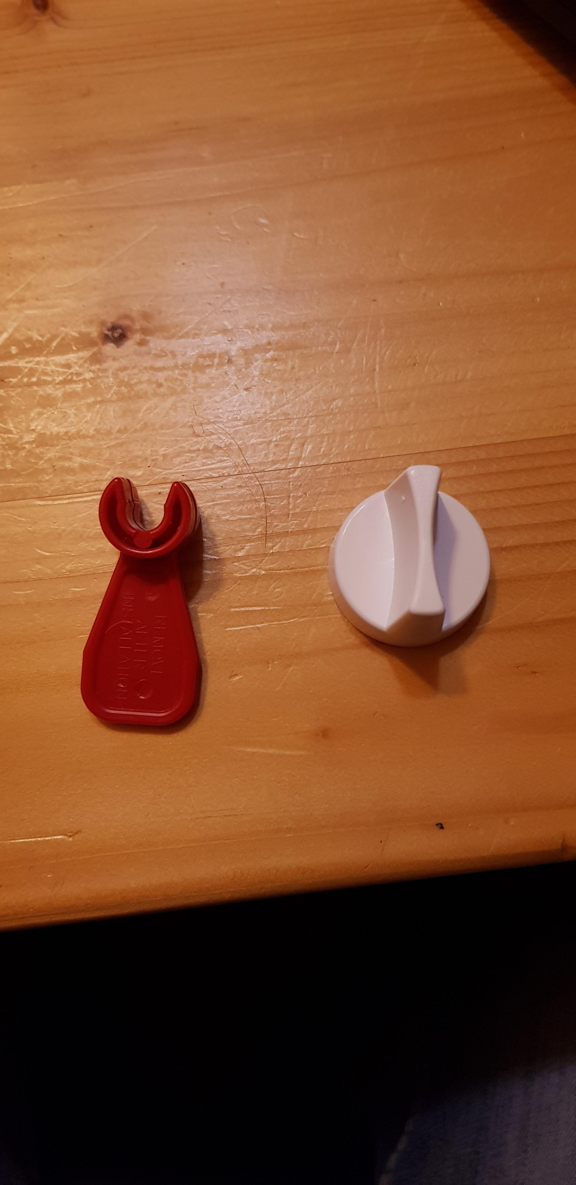 Dann habe ich noch ein zwei Teile gefunden, deren Sinn sich mir nicht erschließt (beide etwa 3 bis 4 cm groß). Auf dem roten steht "Remove after Installation", also evt. Müll, oder ? Wo es lag, habe ich vergessen. Das weiße Teil lag in der Schublade unterm Herd.