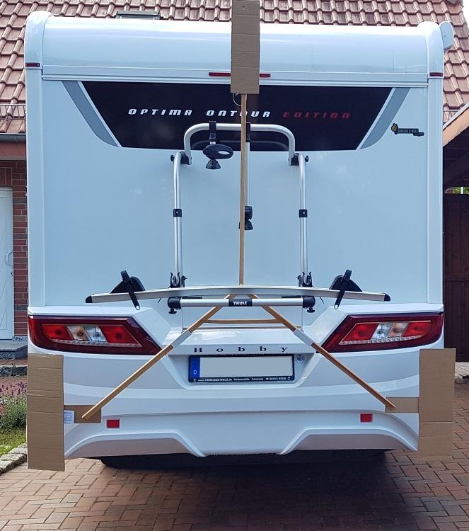So bleibt die Fahrradträger unverändert, du hast ein Träger- Trägersystem und kannst im Alublech deine Befestigungspunkte frei wählen. Wenn du eine Dachreling hast, kannst du nochmals Befestigungspunkte vom Alublech zur Reling setzen (Spanngurte).