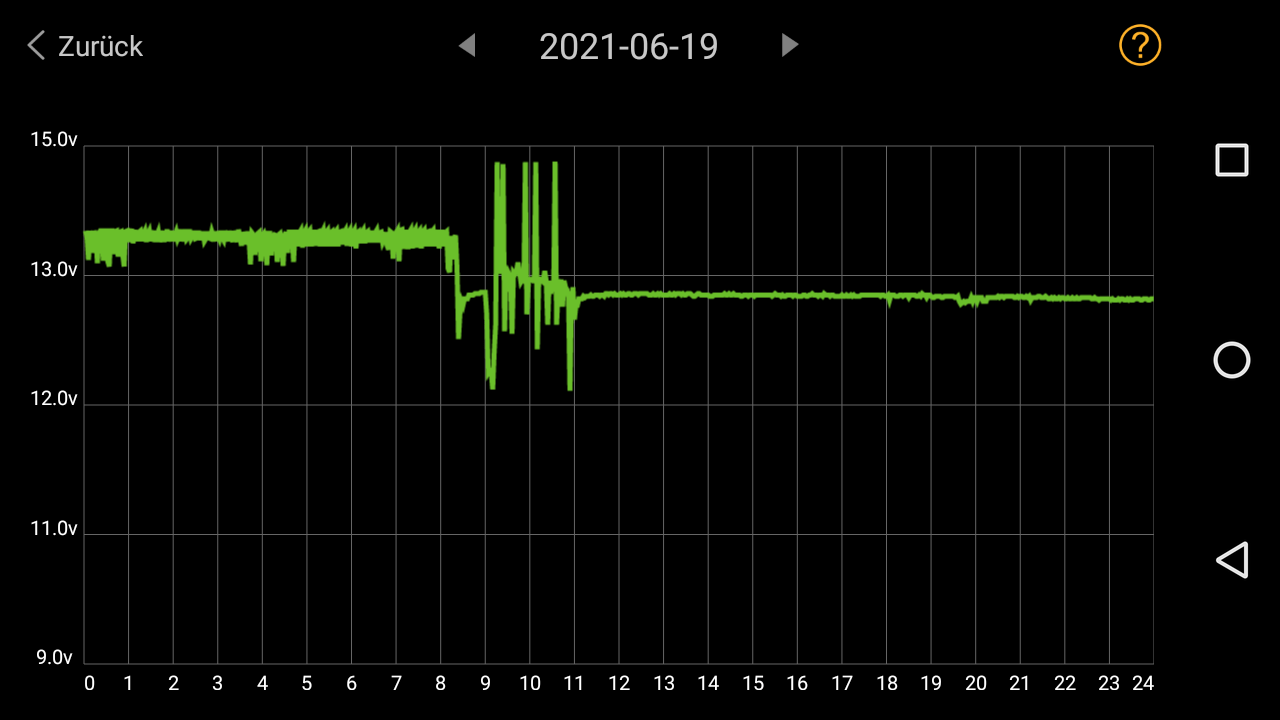 Nicht erklären kann ich mir die mehreren kurzen Ausreißer auf 12,6V (evtl der Stop-and-go-verkehr Auf der Autobahn?).