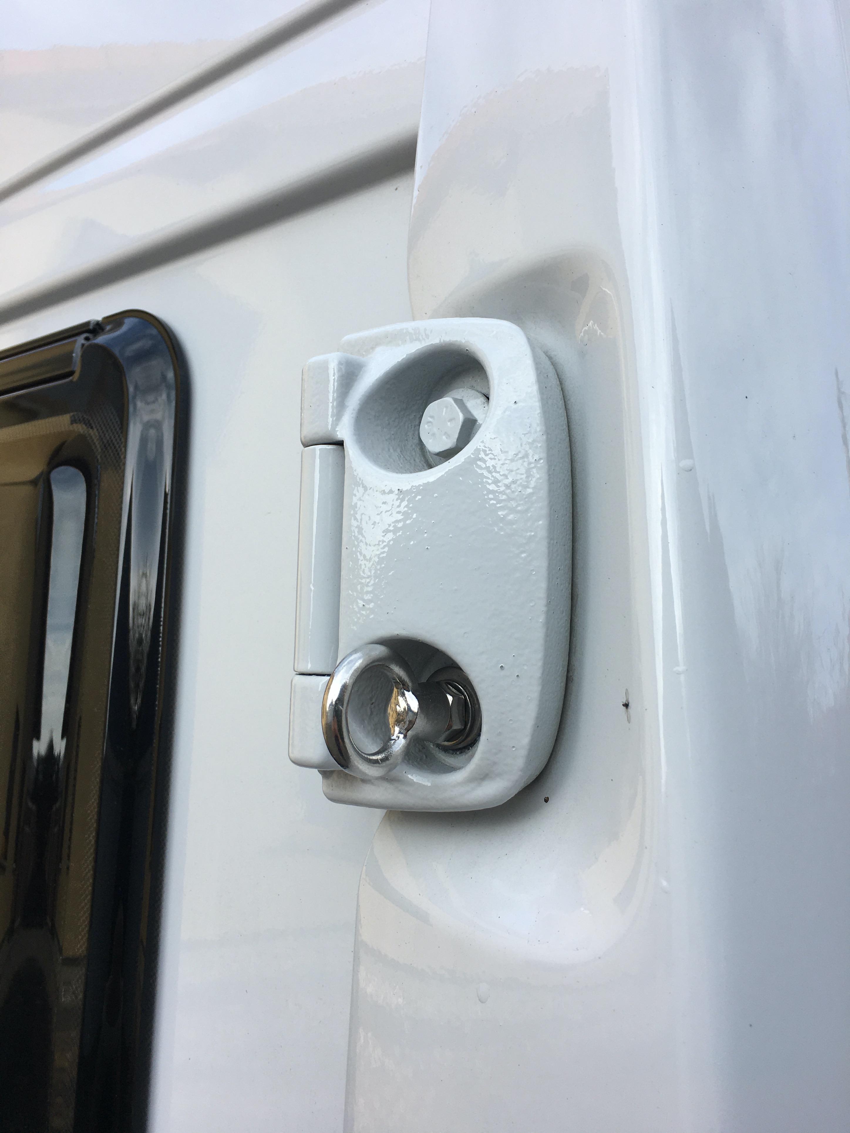 Als zusätzliche Sicherheit habe ich jeweils eine Schraube der oberen Hecktüren-Scharniere durch einen Augbolzen aus dem Bootszubehör ersetzt. Somit kann ich dort noch zusätzliche Gurte befestigen - aber eigentlich geht es auch auch ohne. (Den Tipp hatte ich aus dem Netz.)