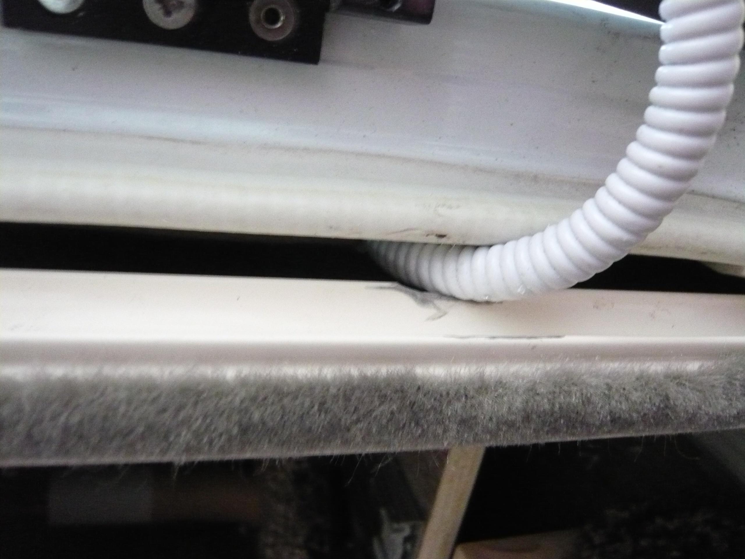 habe noch schnell eine Zeichnung der Steckerbelegung gemacht. Die weitere Verkabelung bringt noch das Problem, wo und wie führe ich das Kabel nach innen. Den Kabelübergang an der Tür befestigen, die Fliegengittertür ganz aufmachen und ein Loch in die Verkleidung bohren, Kabel und Kabelübergang durchstecken. Den Rahmen der Fliegengittertür an der Seite auf Höhe des Kabelübergangs mit einem Dremel etwas abschleifen (der Rahmen sieht aus wie Plastik ist aber lackiertes Alu), damit der Rahmen nicht durch die Kabelführung unten aus der Halterung gedrückt wird. Anschließend habe ich den Rahmen an der abgeschliffenen Stelle mit etwas vorhander Farbe (RAL 9001 - passt ganz gut) wieder ausgebessert.