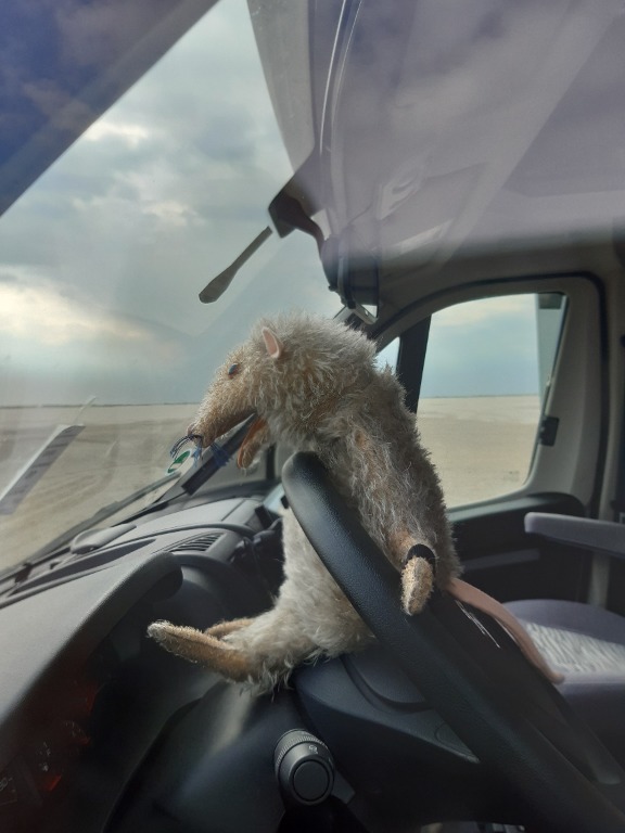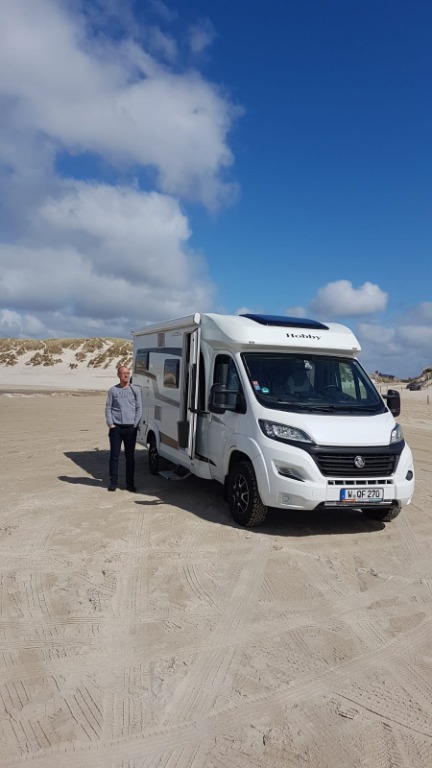 Befahrbarer Strand von Lakolk auf der Insel Römö. Sturmböhen bis 75 km/h. WoMo hat ganz schön gewackelt. Leider zu windig und zu kalt für einen Sitzplatz "outdoor". Auf den Bildern kann man die Sandverwehungen erahnen. WoMo ist jetzt "sangestrahlt" und ca.5 kg schwerer durch Ballast-Sand. Es empfiehlt sich ein Schaufelblech und einen Staubsauger an Bord zu haben. Alles knirscht....