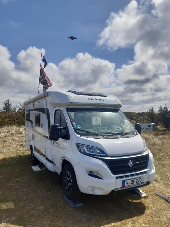 Campingplatz in den Dünen von Vejers Strand. Für jeden Camper was dabei: Ob Zelt, Wohnwagen, WoMo, selbausgebauter Vanlife-Kastenwagen oder für die 4x4-Allrad-Fraktion. Tolle Location. Haben versehentlich einen Stellplatz auf einem Hügel für Zelt-Bewohner und leichte Offroad-Fahrzeuge bezogen. Dank fester Bodenverhältnisse und grobstolligen Allterain-Reifen war der Aufstieg für den Hobby problemlos möglich. In den Dünen war es etwas windstiller (Windstärke ca.2-4 BFT). Die Beflaggung konnte gehisst werden und unser Fledermaus-Drachen hat auch einige Flugstunden absolviert ohne sich die Flügel zu brechen.