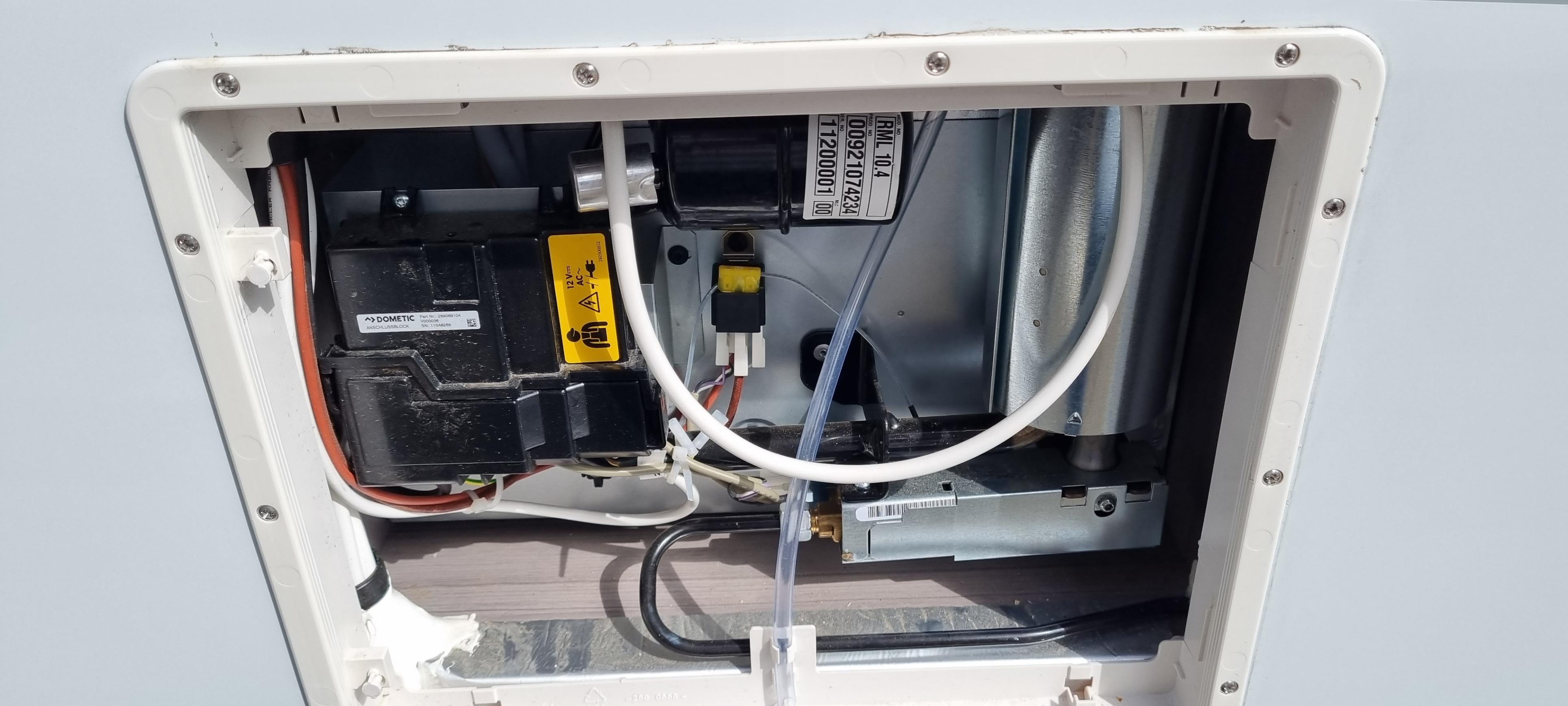 • Wenn Du das Lüftungsgitter außen wegnimmst, siehst Du das Gefäß am Rohr, der Verdampfer . Bei extremer Nässe läuft der über auf das darunter liegende Brett. Da das nur zusammengefügt ist, läuft das Wasser durch in den Innenraum und kommt als Rinnsal unter dem Kühlschrank Hervor.