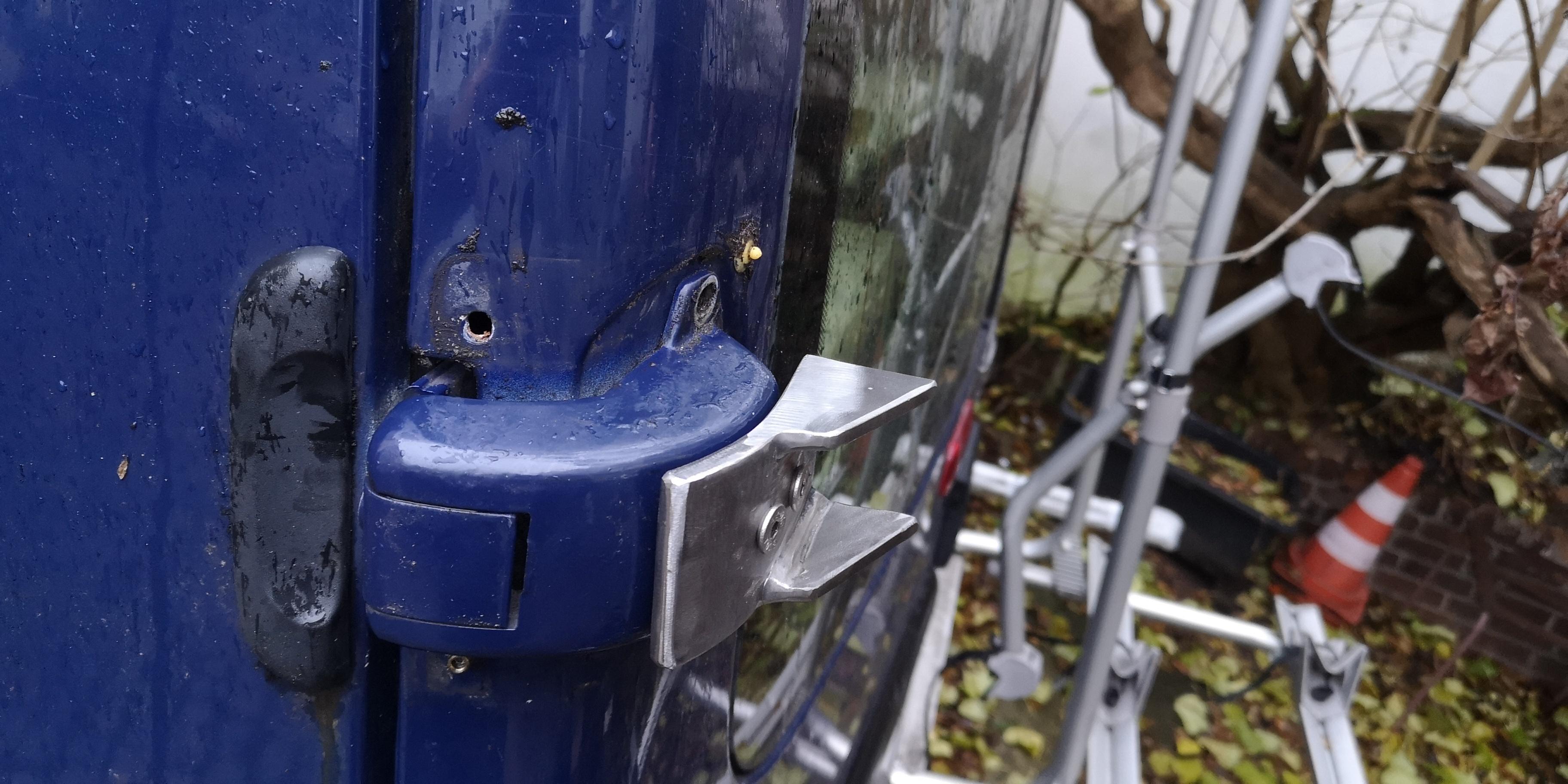 Die Reserverad-Halterung wird an den aussen liegenden Scharniere der HeckKlappe befestigt, ein 3.Anschraubpunkt ist durchs Blech der einen Hecktür. Solche Halter mit diesen Befestigungspunkten gibt's auch fertig zu kaufen, eine TÜV-Zulassung benötigrn diese Halter unseres Wissens nach nicht.