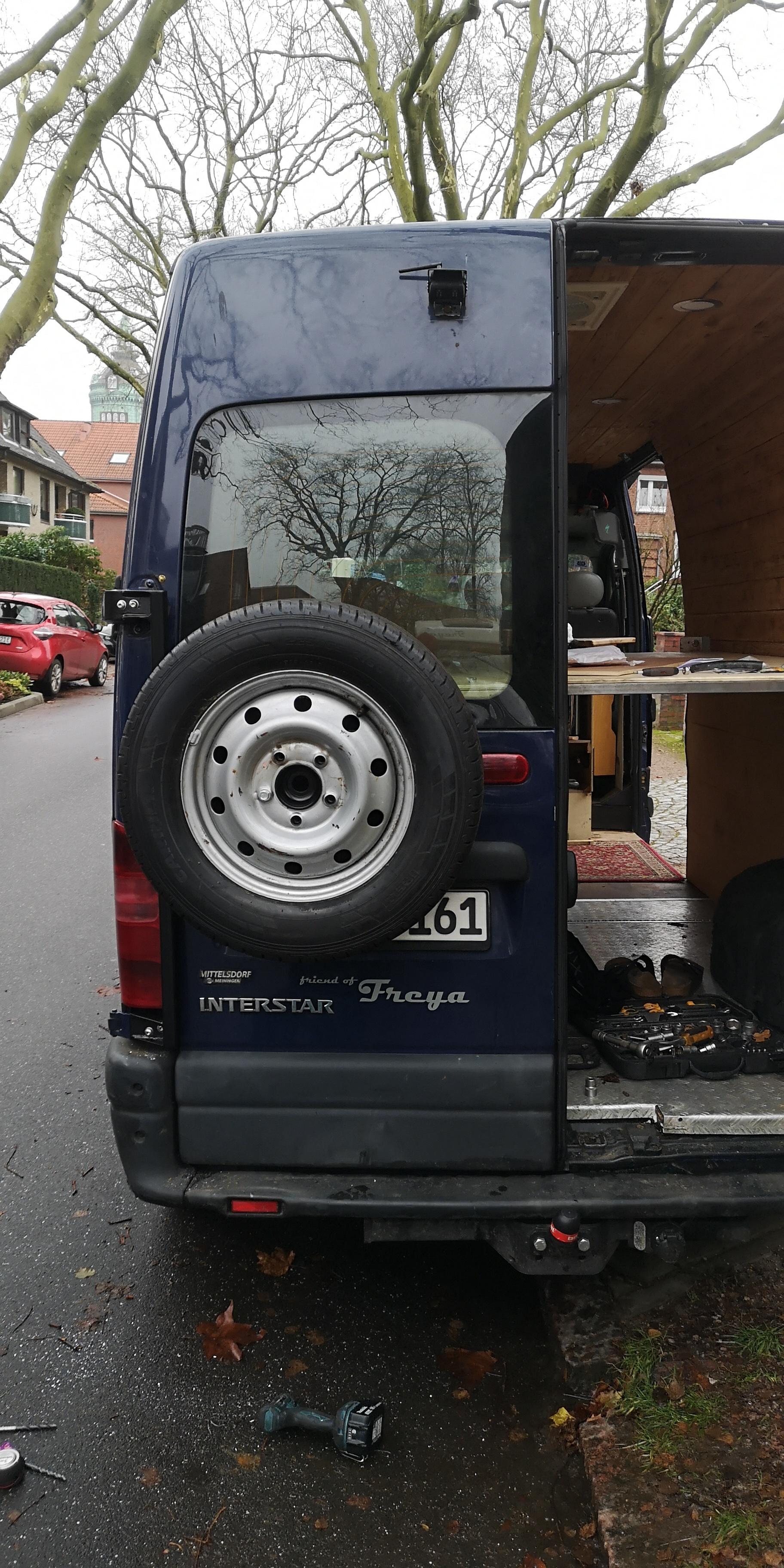 Der Geistesblitz: das Reserverad fliegt raus, wir haben eine Reserverad-Halterung für die HeckTür gebaut.