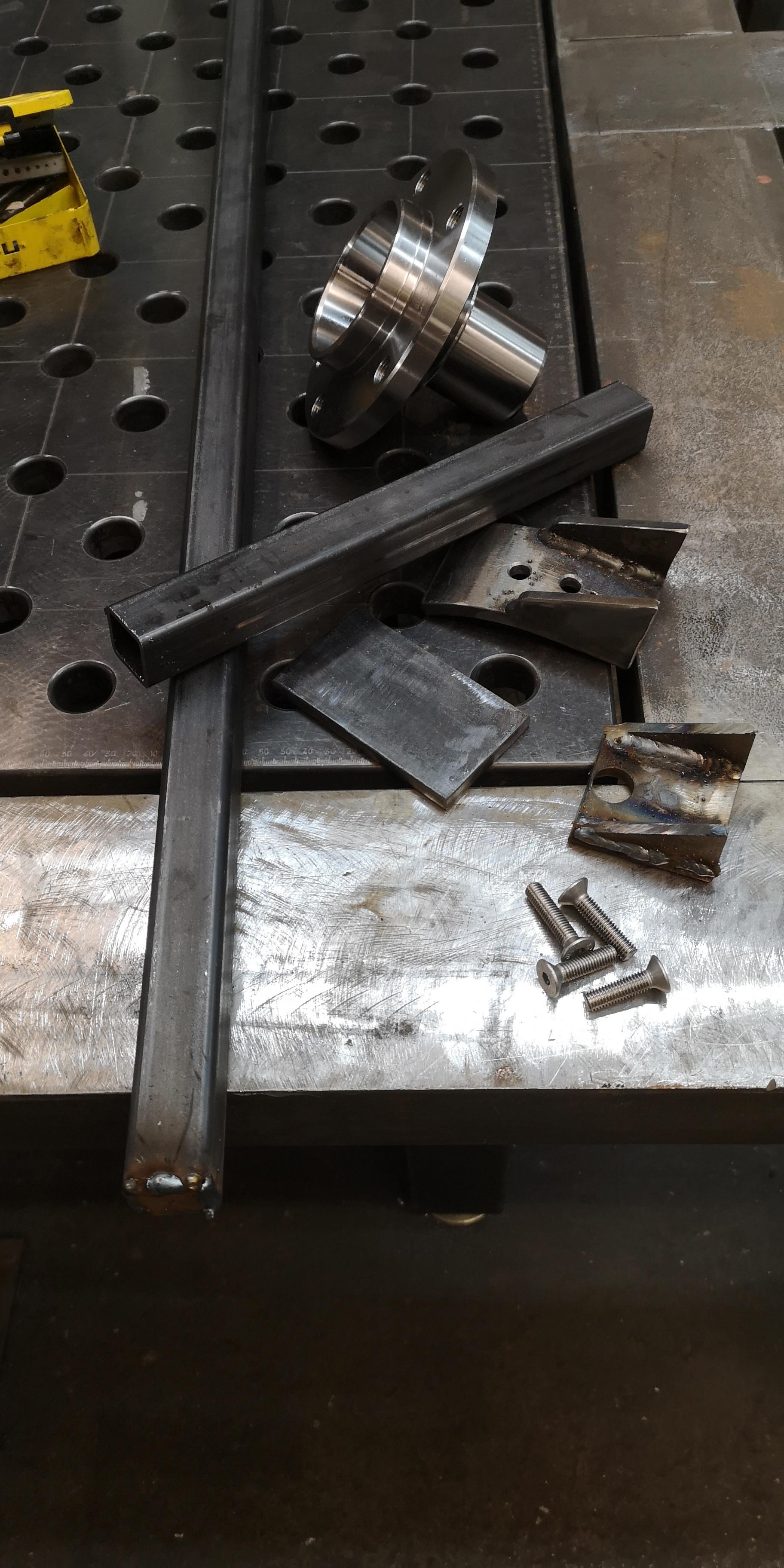 Bennet hat günstig eine Original Radnabe geschossen und Stahlrohr, Winkel, Flachstahl haben wir besorgt.