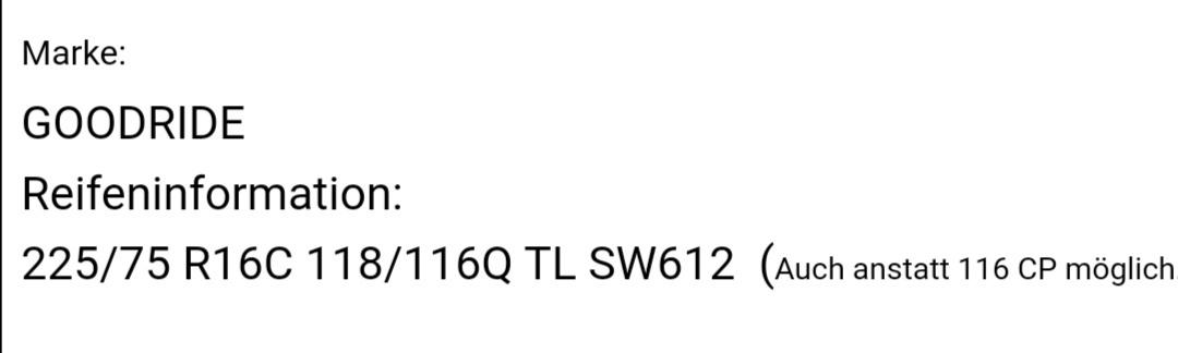 da ich in wenigen Wochen mit meinem neuen WoMo wegfahren muss/darf und ich nicht mit Sommerreifen auf Tour gehen will, habe ich mich heute auf die Suche nach Winterreifen in der Größe 225/75R16CP 116q gemacht, leider ohne Erfolg.