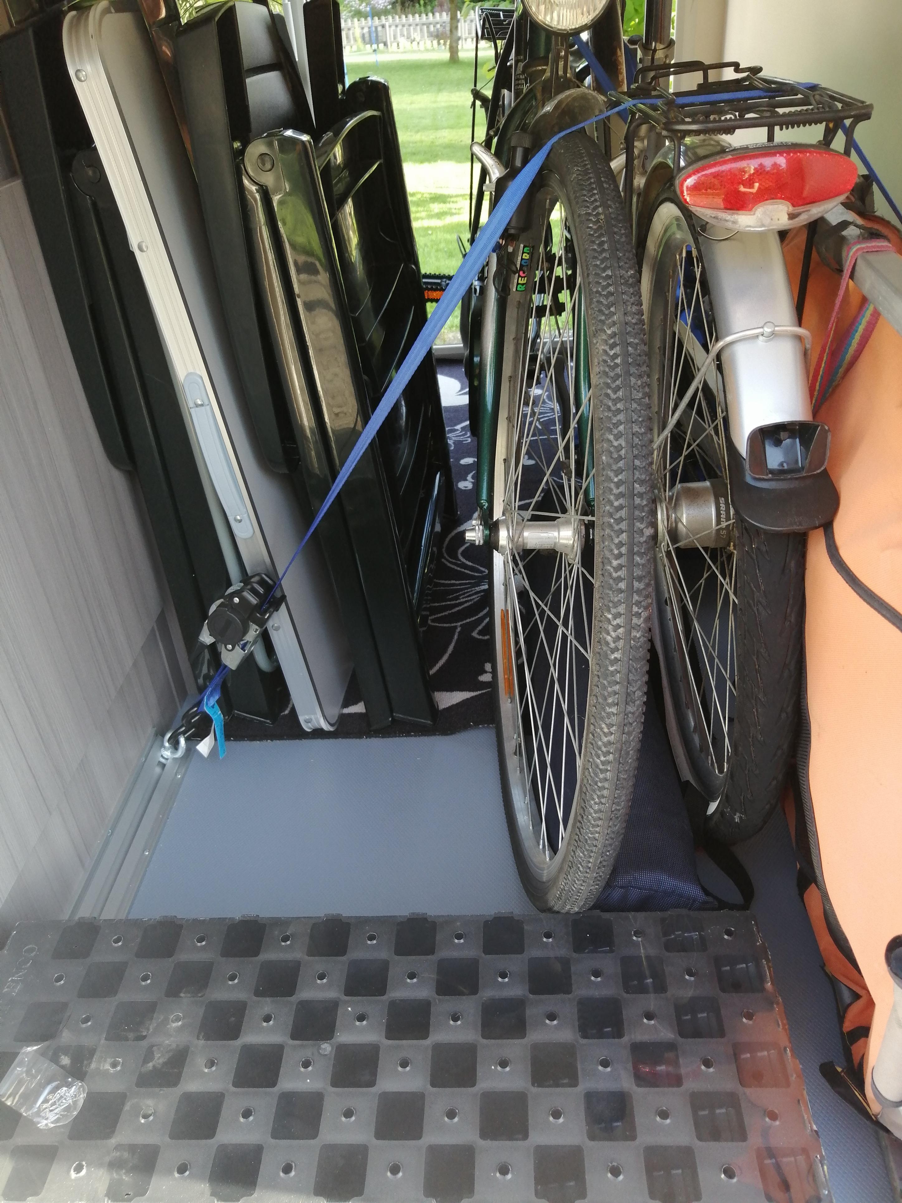 - evtl. müssen Inhalte (Kisten/Stühle) aus der Heckgarage geräumt werden, um an die Fahrräder zu kommen