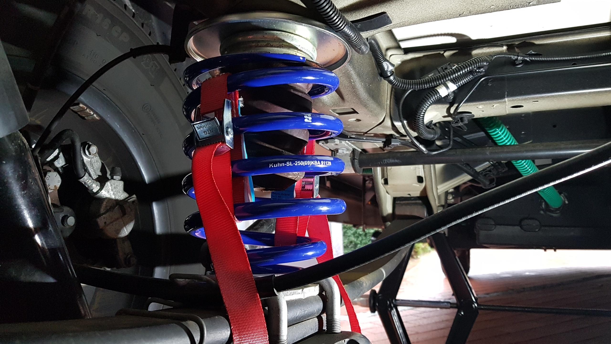 Hallo Joachim, das Fahrzeug habe ich mit dem Original Wagenheber angehoben. Ging besser als gedacht danach das Fahrzeug unbedingt mit Stellböcken, Vorlegekeile und Holzbohlen absichern. Wenn du den langen Gummidämpfer hast, ist ein Einfädeln der Spiralfeder nicht möglich, auch wenn sie vorgespannt ist. Dèr Einbau ist dann nur möglich ,wenn die Blattfeder hinten ausgehängt wird und das Fz noch höher angehoben wird. Achte auf die Bremsleitung.