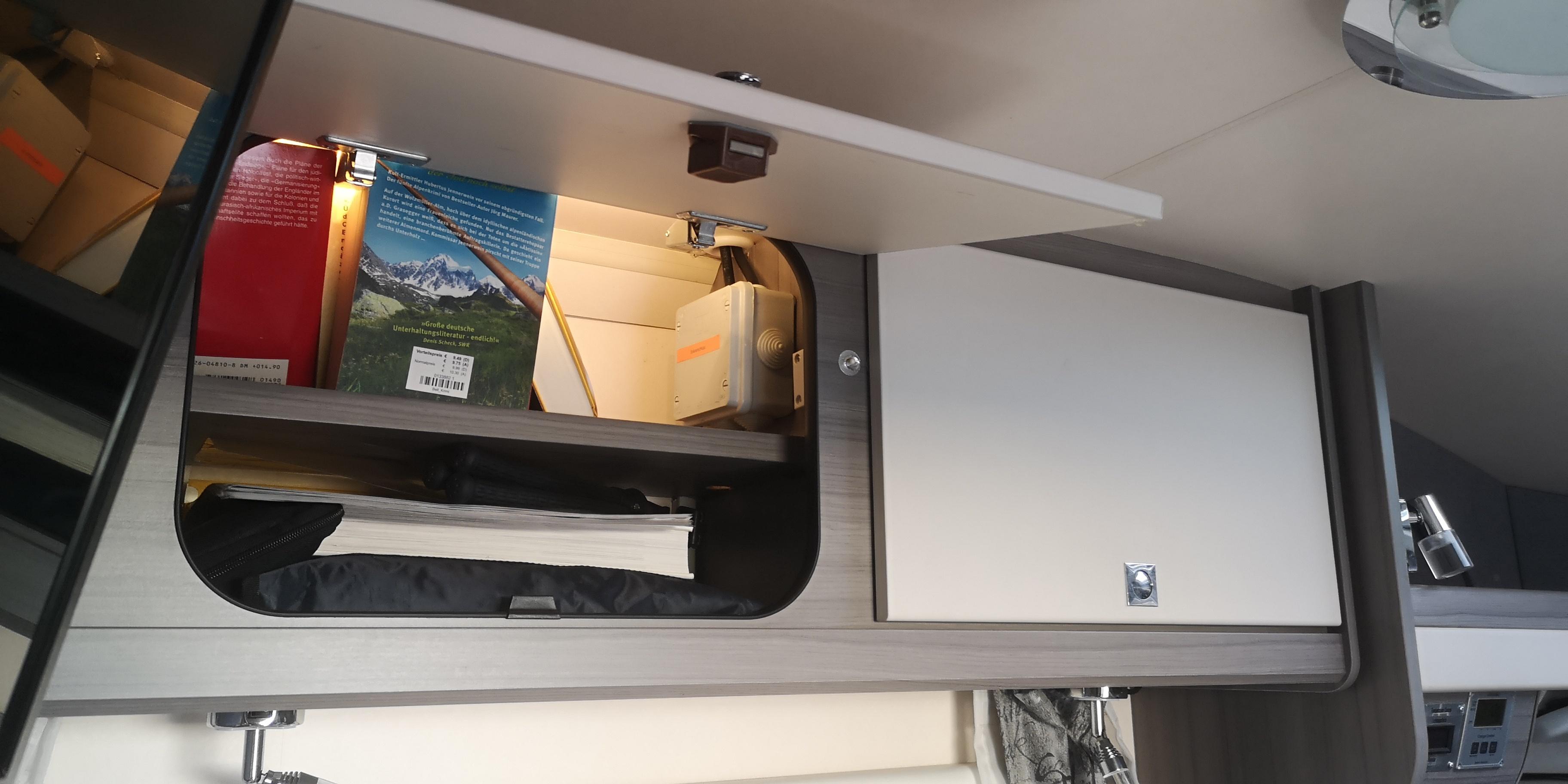Die Dachdurchführung ist im Schrank über der Sitzbank, also dem Schrank, der an der Wand zum Bad ist. Und dann aber an der schrankinnenseite, die zur Front hin ist