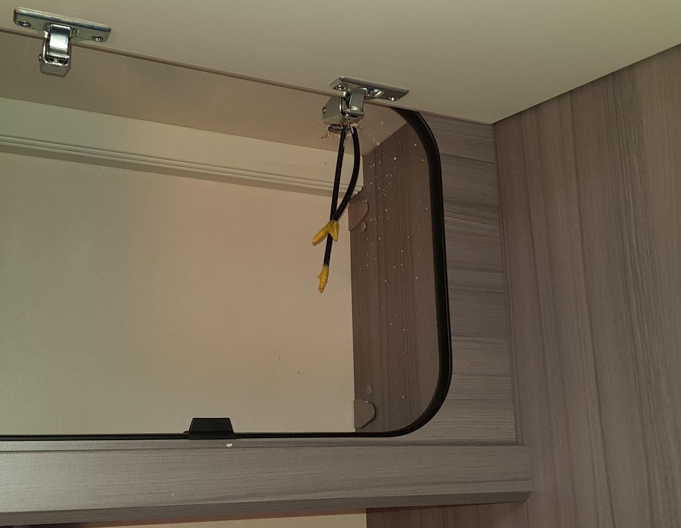 Die Dachdurchführung ist im Schrank über der Sitzbank, also dem Schrank, der an der Wand zum Bad ist. Und dann aber an der schrankinnenseite, die zur Front hin ist