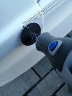 Die Enden, die nun herausstehen, mit einem z. B. Drehmel Kappen und die Fläche glätten.Danach spachteln, Lackstift und fertig.