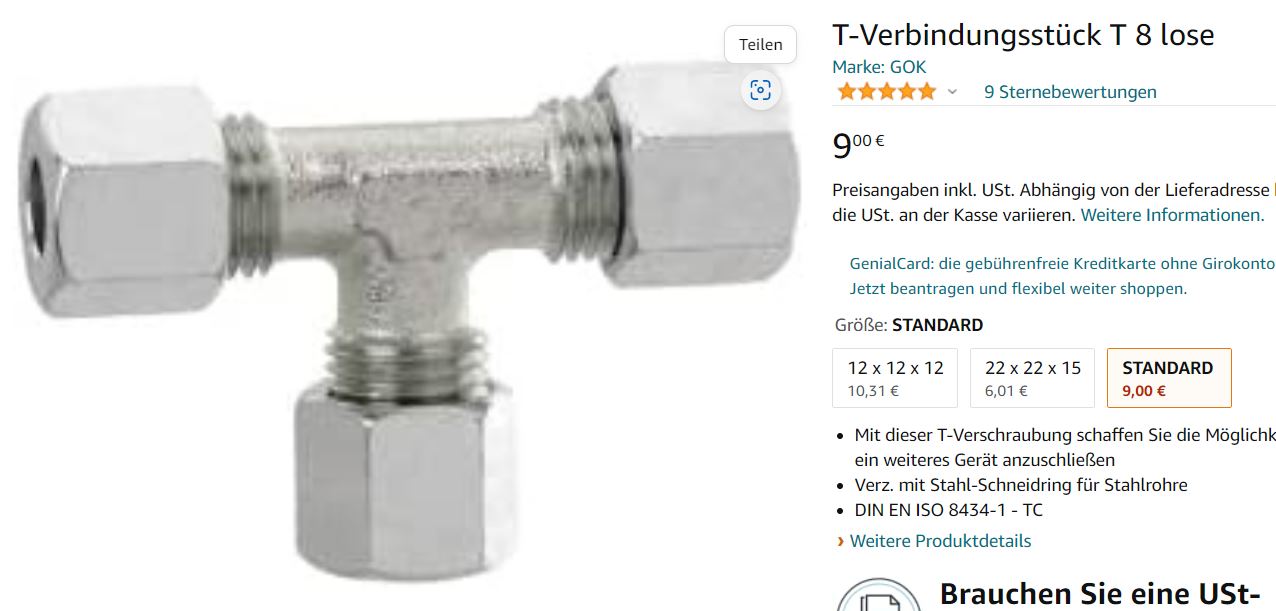 Noch ein Stückchen 8mm Gasrohr und fertig. Winkelstück am Kühlschrank raus, T-Stück rein, Stückchen 8mm Rohr und Hahn verbinden, fertig. Kein bohren nötig.