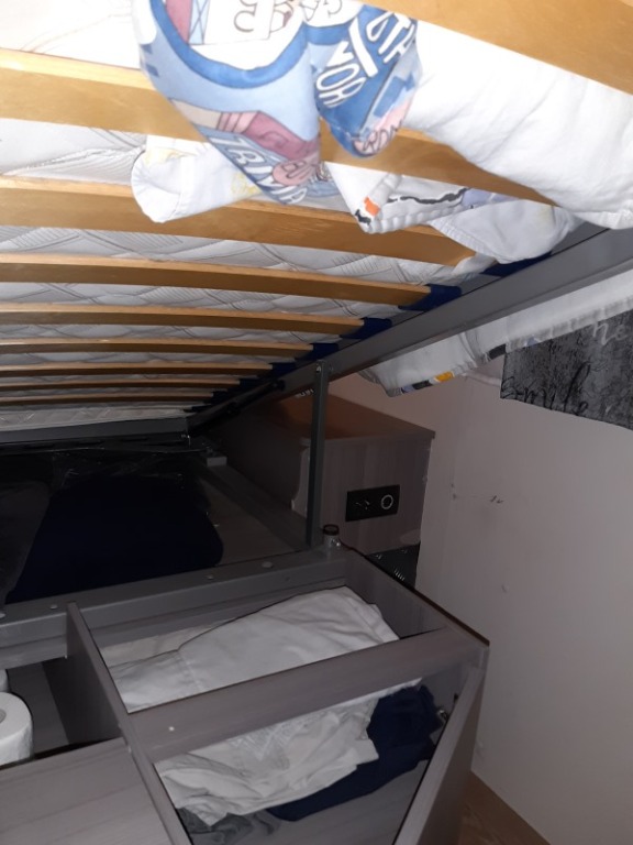 wir haben den auch Baujahr 2018. Das Teil bleibt oben selbst mit Bettzeug drauf. Man kann in Ruhe in der Kiste drunter rumkramen. -