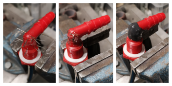 ich würde auch zu Sekundenkleber in Gelform greifen und nach dem Härten würde ich das Ganze weitläufig mit einer Heißklebepistole überziehen. soweit, dass du gerade noch den Schlauch fixieren kannst. Toi,Toi,Toi.