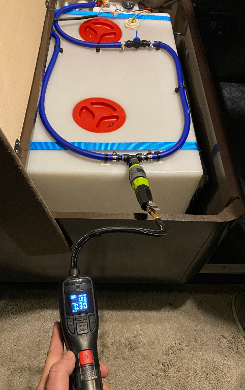 Die Leitungen von der Küche aus mit einem Maximal Druck von 0,5 Bar durchblasen. (Küche = weiteste Weg zum Tank bei meinem Modell)