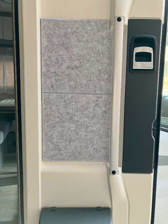Hallo Uli, erst hatte ich vor vorn den Himmel komplett mit Akustikplatten zu bekleben. Das ist aber nicht notwendig da diese die Reflektionen verhindern und man im Raum teoretisch nur an einer großen Fläche etwa 4-6 Platten braucht. Die Kunststoffoberfläche der Tür habe ich auch deshalb von mir bedacht worden, und der Effekt ist gut. Kaum noch Hall. Im Anhang nur einige Bilder, unter der Fußmatte habe ich dann wie bereits erwähnt dunkelgraue Platten geklebt. Natürlich halten diese nicht bombenfest aber der Kleber verhindert das diese vorrutschen würden. Während der fahrt habe ich zugeschnittenen Akustikschaumstoff in die drei Dachfenster gelegt und Insektenschutz als Fallstop genutzt. Habe Foto vom Akustikschaumstoff auf dem Tisch liegend im Anhang. ( Soniflex Akustikschaumstoff Pyramide/ Schallabsorber) Für das große Panoramafenster muss der Schaumstoff nur etwa 3cm stark sein. (Plattenabsorber glatt aus Basotect grau). Gruß Ronald