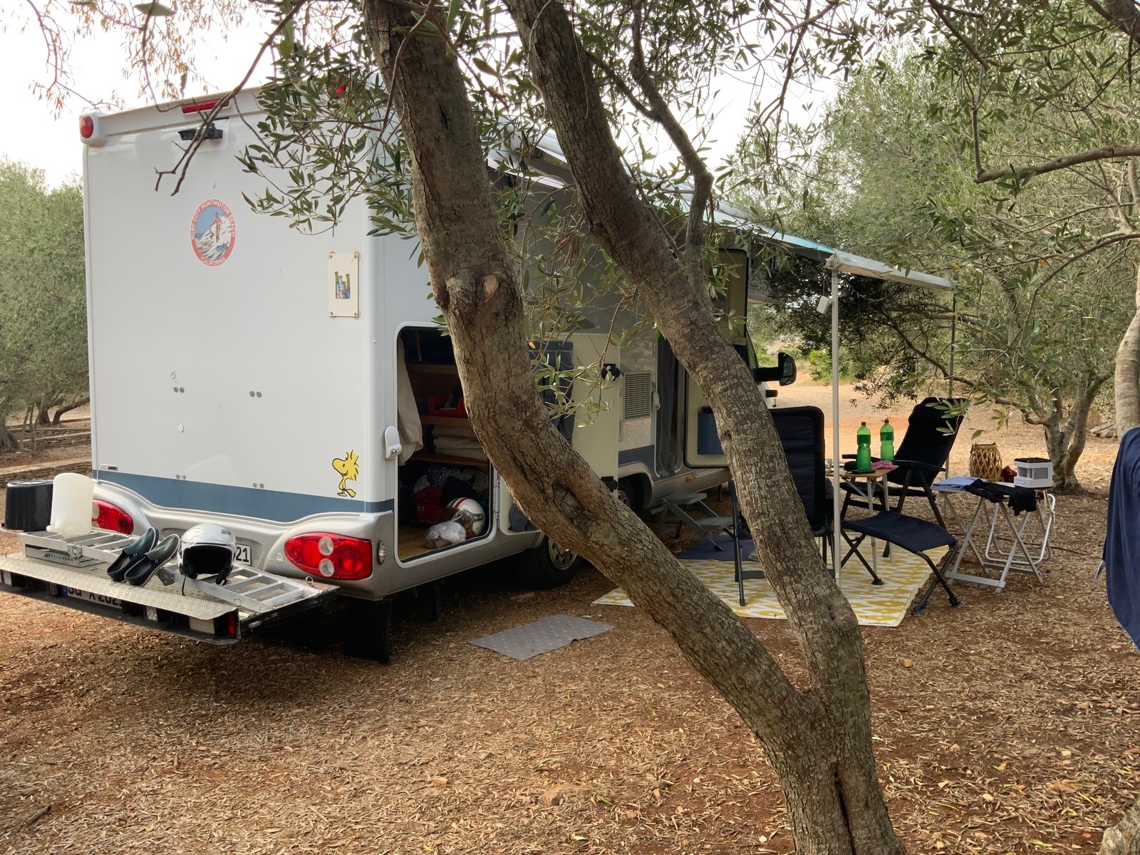 Die von mir sträflicherweise draußen gelassene Möblierung ist vom Wind in einem Umkreis von mehreren Metern verteilt, nass und unsagbar dreckig. Selber schuld. Vor dem Morgenkaffee, den wir aufgrund des Zustandes unserer Klappsessel im Stehen genießen durften, war Aufräumen und sonnentrocknen angesagt. Wir haben uns deshalb auf unser SUP gesetzt (lag unterm Bob), sind erstmal eine Runde durch die Bucht gepaddelt und haben so einiges aufgesammelt, was von den Schiffen verloren ging, unter anderem ein einzelner Flipflop und eine Hölzerne Verschlussklappe einer Plicht.