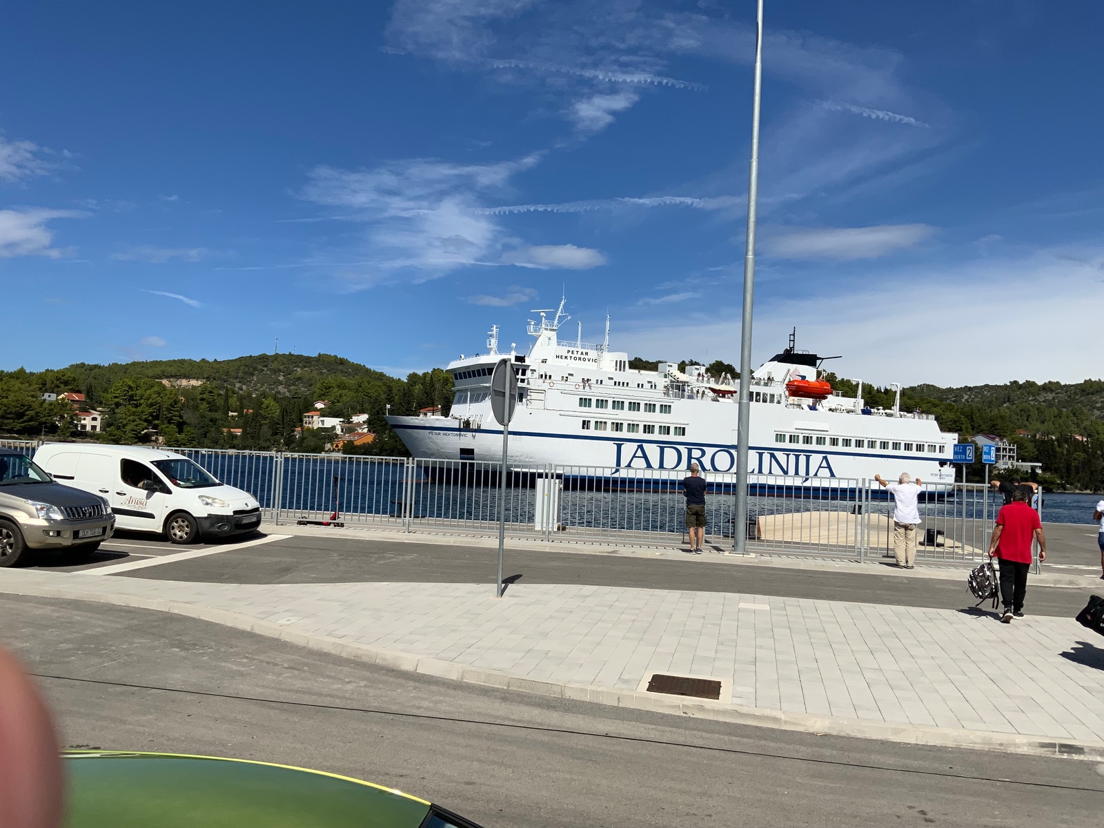 Bei der Anfahrt zum Fährhafen am besten in Vela Luka rechts ab von der Promenade durch den alten Hafen Richtung Industrie 🏭. Diese Straße ist nicht so eng, wie jene durch den Ort auf dem Hinweg. Oben an der Einmündung zur Umgehungsstraße befindet sich ein großer Tommy Markt, rechts ist bereits die Fähre (Trajekt) ausgeschildert. Verladung war pünktlich und unproblematisch, die Jadrolinja Fähren sind echte RoRos, also vorwärts Rein übers Heck, Vorwärts raus über den Bug.