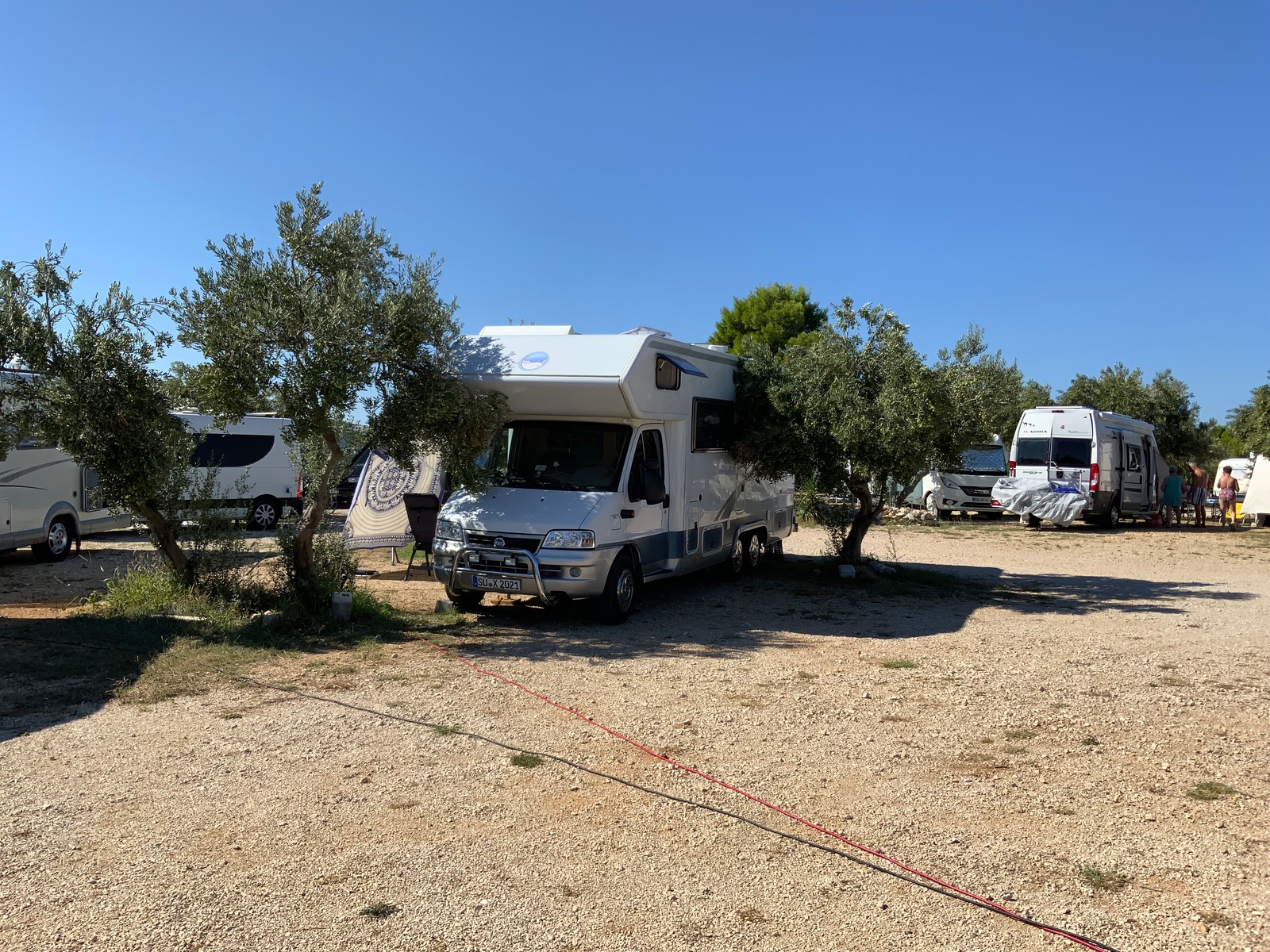 Wir haben unseren letzten Campingplatz in Kroatien verlassen. Bezahlt haben wir 24,- pro Nacht. Nach unserem Eindruck wird dieser Platz von Langzeitcampern mit vielen Hunden frequentiert, die erste Reihe am Strand ist wohl dauerhaft durchreserviert.
