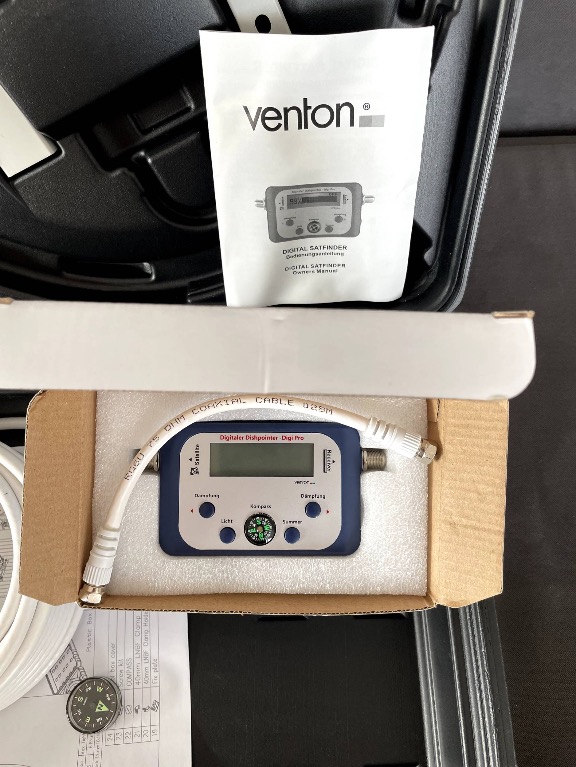 Im Koffer die SAT-Schüssel, LNB, Sat-Finder, Aufbau- und Benutzeranleitungen, Befestigungsmaterial, SAT-Kabel