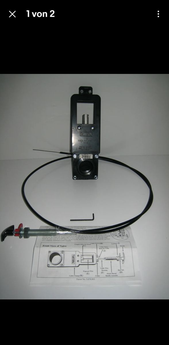 Unser Abwassertank hat ein Ventil von Valterra, dass man mit eine T Griff und Bowdenzug öffnen und schließen kann.