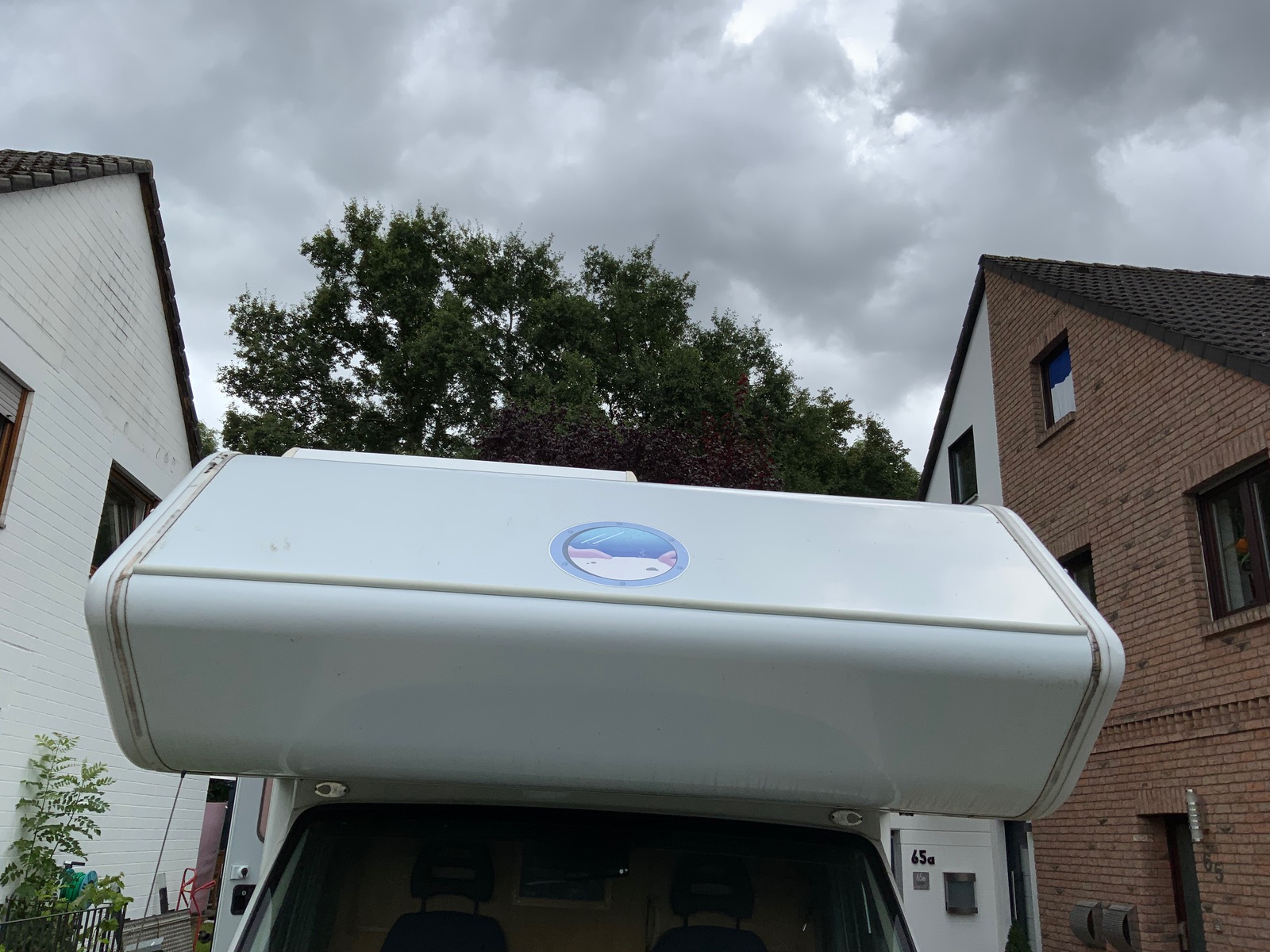 Ich habe sie ganz vorne an der „Spitze“ des Alkoven aufgeklebt, und auch über die komplette Länge der Markise, denn auch dort gab es oft eine ungewollte Dusche, weil sich bei Regen immer eine größere Menge Wasser in der Kuhle auf dem Dach sammelt.