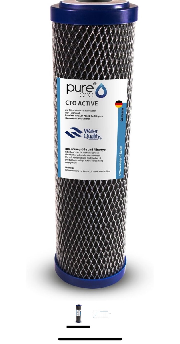 Es handelt sich um ein PureOne Doppelfilter für 10“ Kartuschenfilter. Der Kokos-/Aktivkohlefilter hat eine Filterfeinheit von 0,001mm und filtert bereits die meisten Partikel raus. Der nachfolgende Keramikfilter hat 0,0003mm und macht den Rest. Diese Feinheit ist kleiner als Viren oder Bakterien und hält meine Anlage komplett sauber.