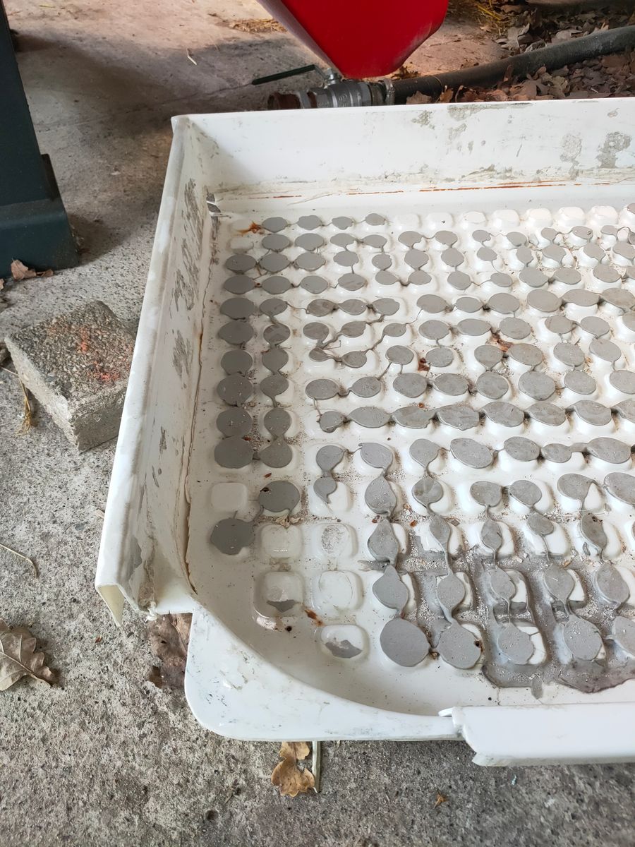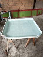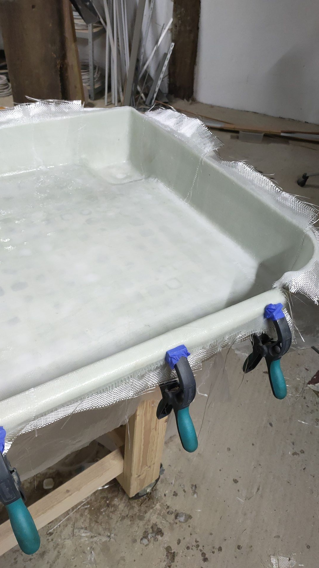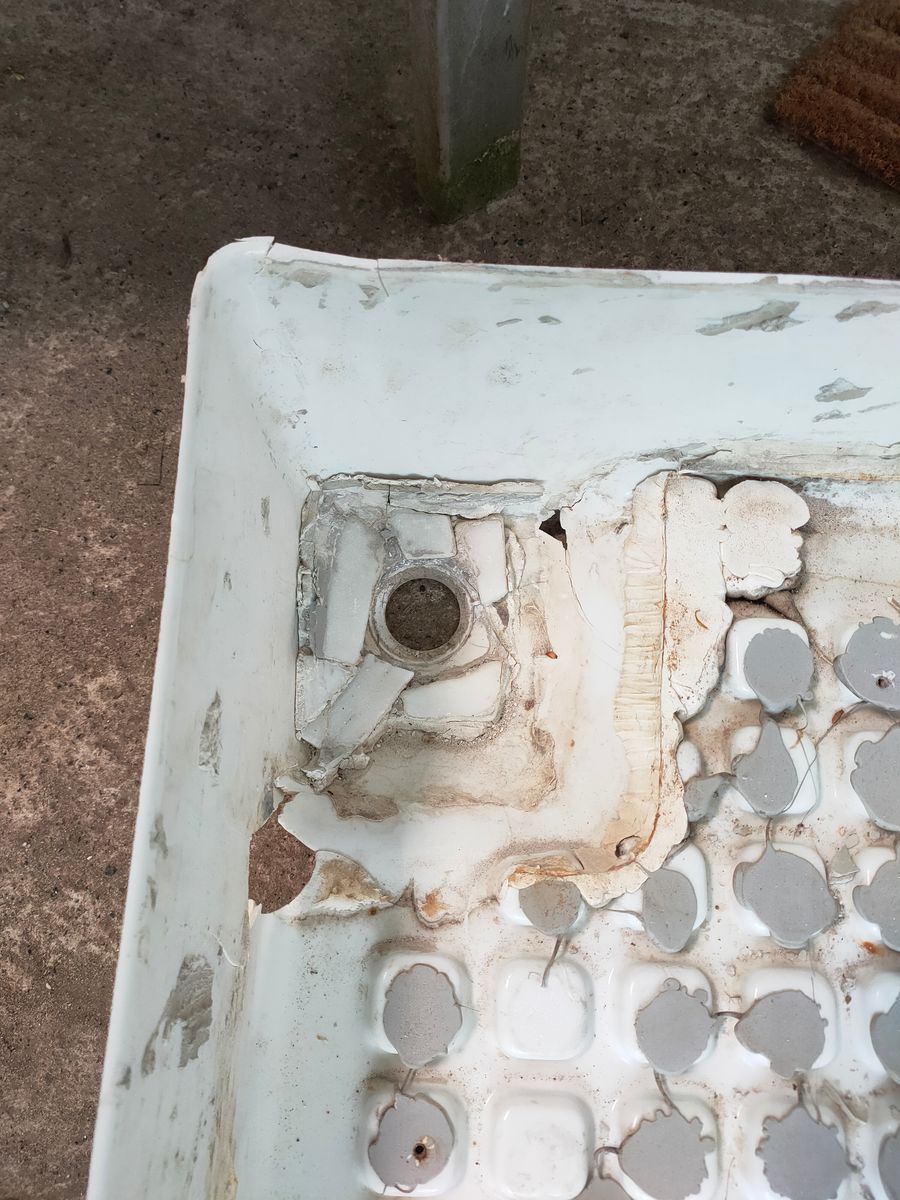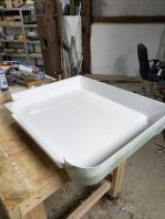 Die Risse habe ich anschließend mit einem Kunststoff-Schweißgerät repariert. Als die Duschwanne wieder grob ihre ursprüngliche Form hatte, habe ich sie von außen mit Epoxidharz und Glasfasermatten beschichtet. Danach wurden die Noppen von innen mit einem Multimaster abgesägt, und die Innenseite ebenfalls mit feinen Glasfasermatten und Epoxidharz verstärkt.